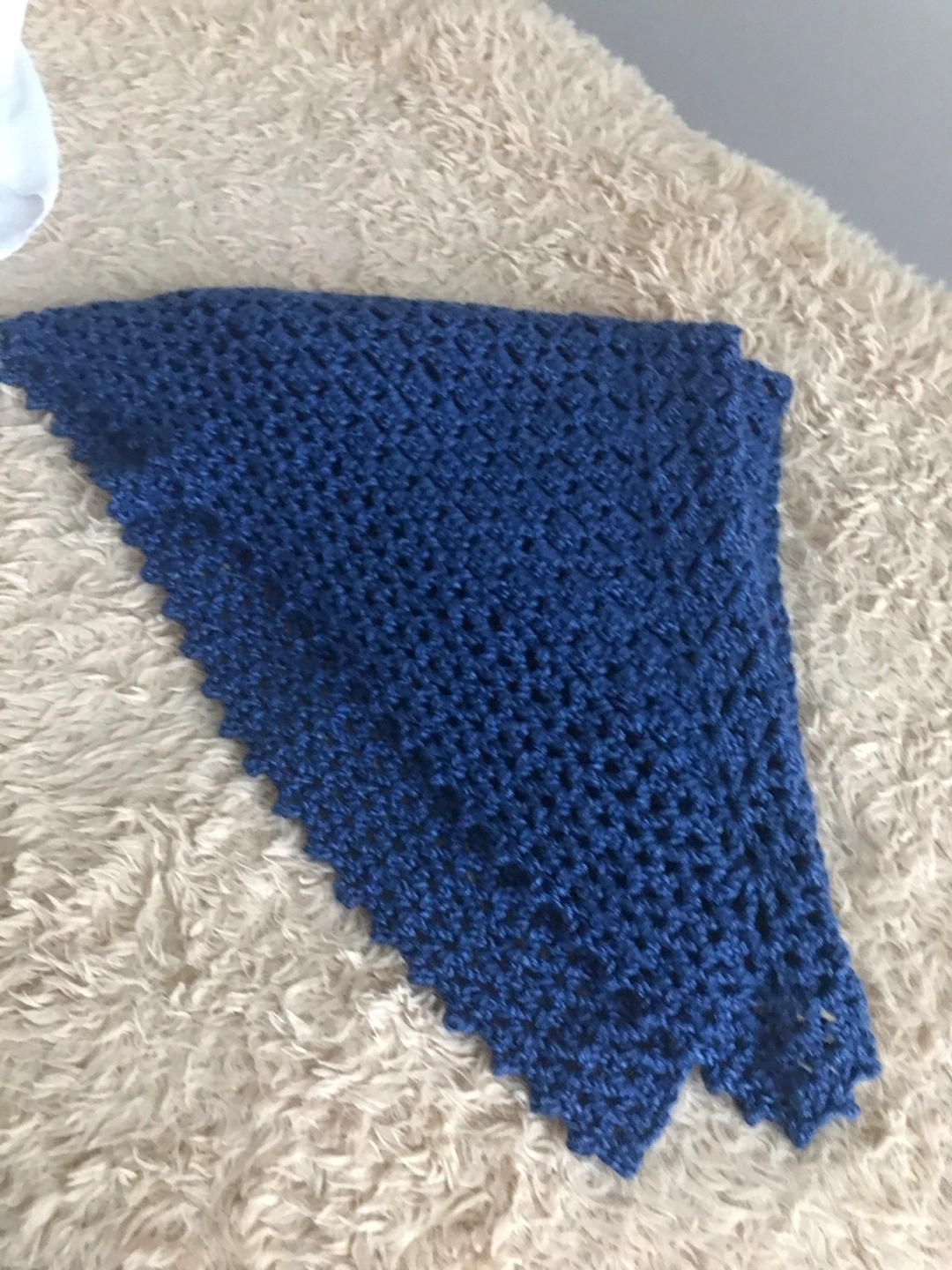 Beautiful handmade crochet shawl. Navy blue colour. Triangle shape. Intricate stitch pattern. Lovely addition to any outfit. Perfect for layering.