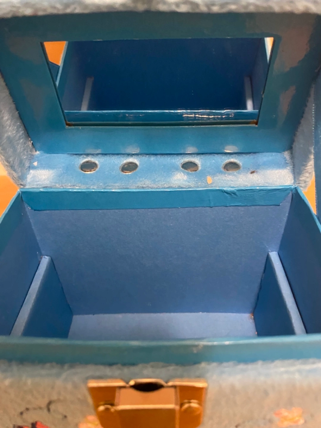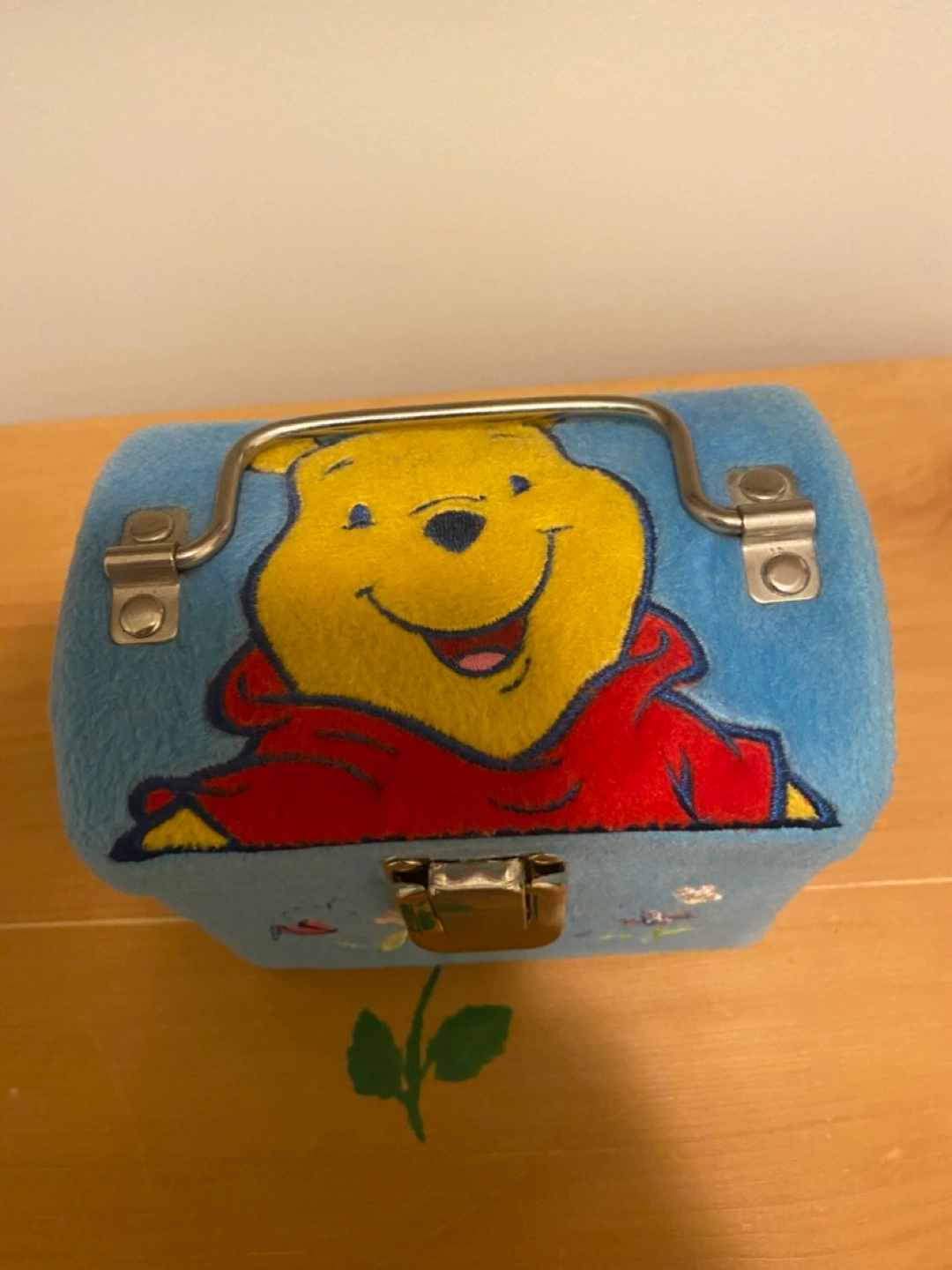 Adorable Winnie the Pooh jewellery box. Blue plush exterior. Features a metal handle and clasp. Small mirror inside. Perfect for storing small trinkets.