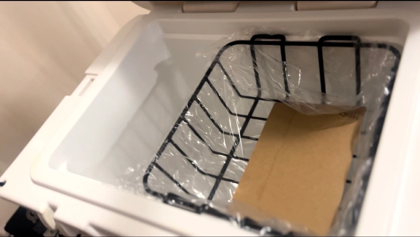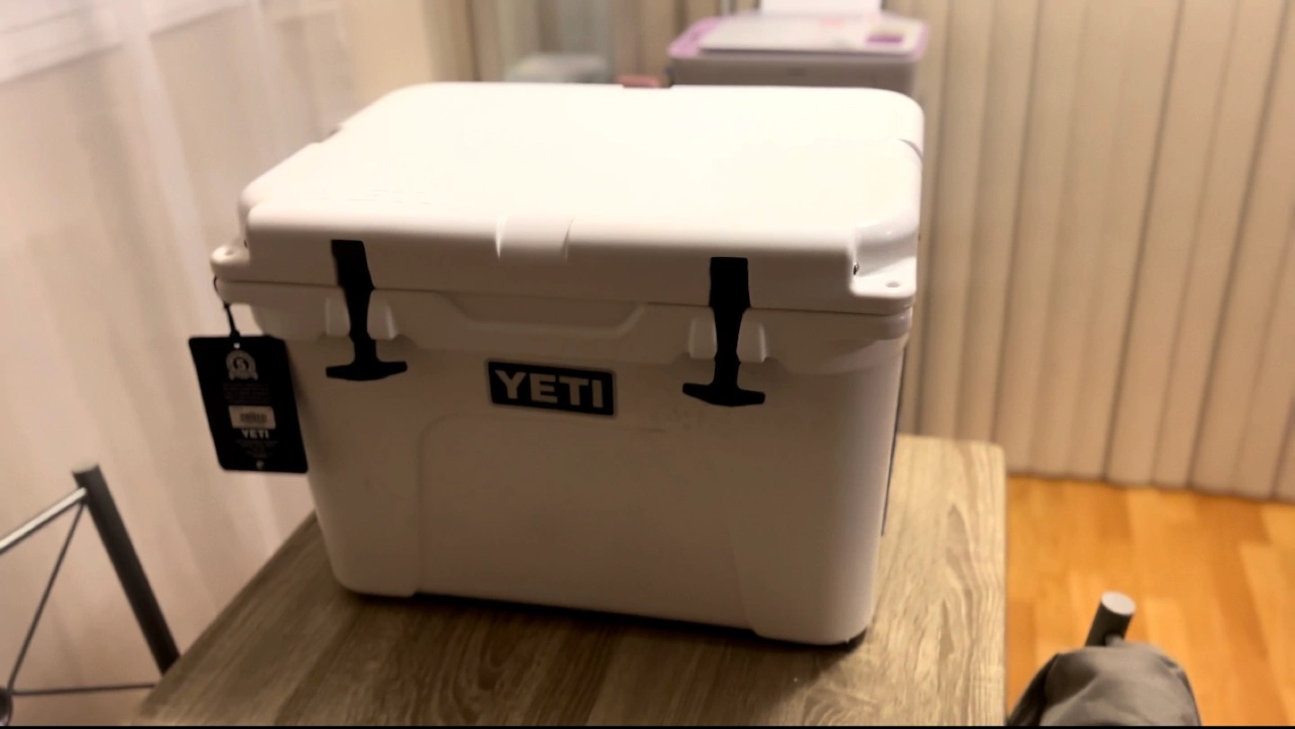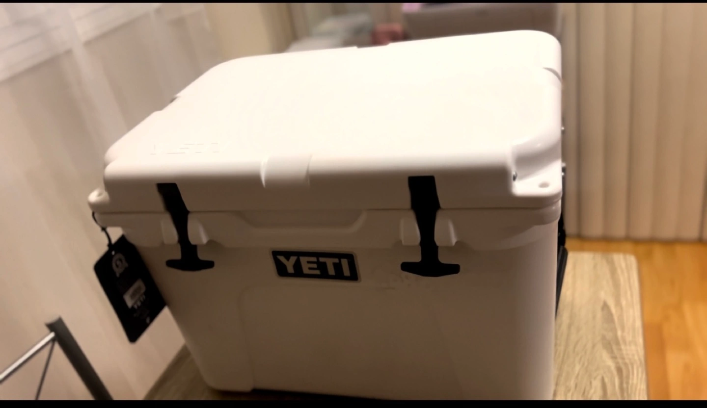 White YETI Tundra 35 hard cooler. Includes a wire basket. Great for keeping things cold.