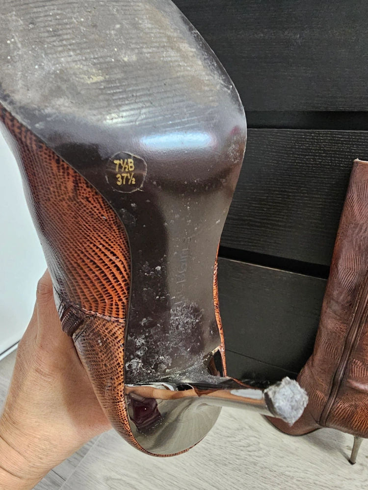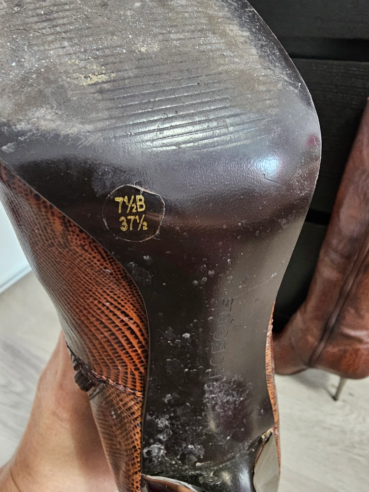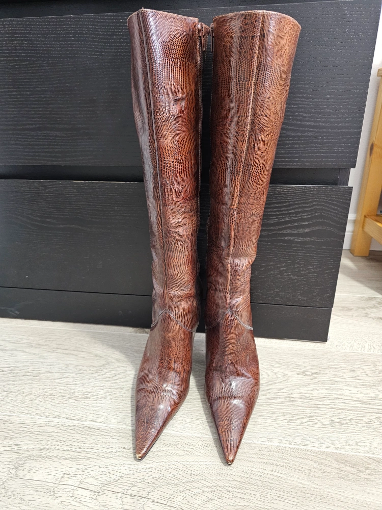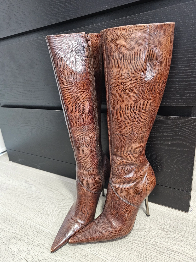 494Gorgeous brown leather knee-high boots. Pointed-toe stiletto heels. Side zip closure. Has a little wear and tear on the tip.