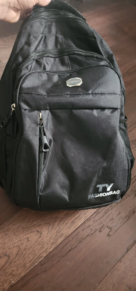 Large black backpack. Multiple compartments. Durable material. Suitable for everyday use or travel.