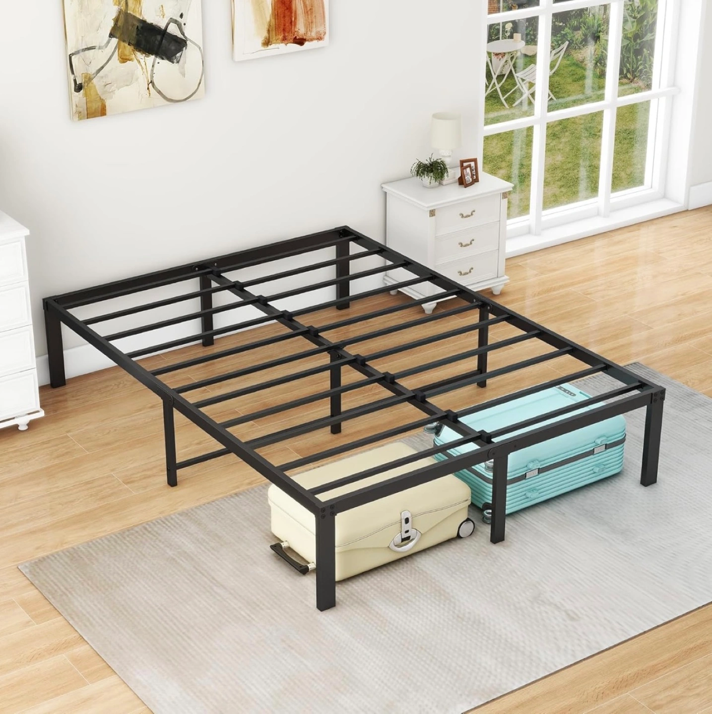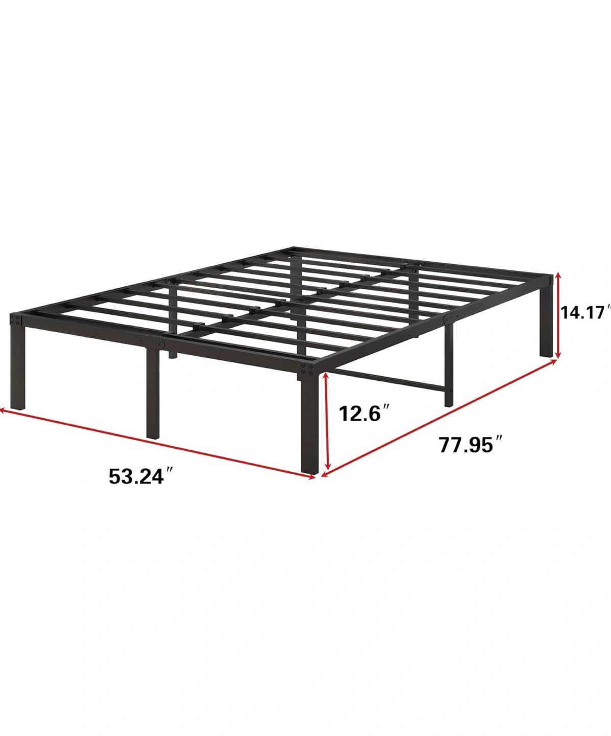 Double-size metal bed frame. Durable steel construction. Easy assembly. Sleek, minimalist design. Provides ample under-bed storage.