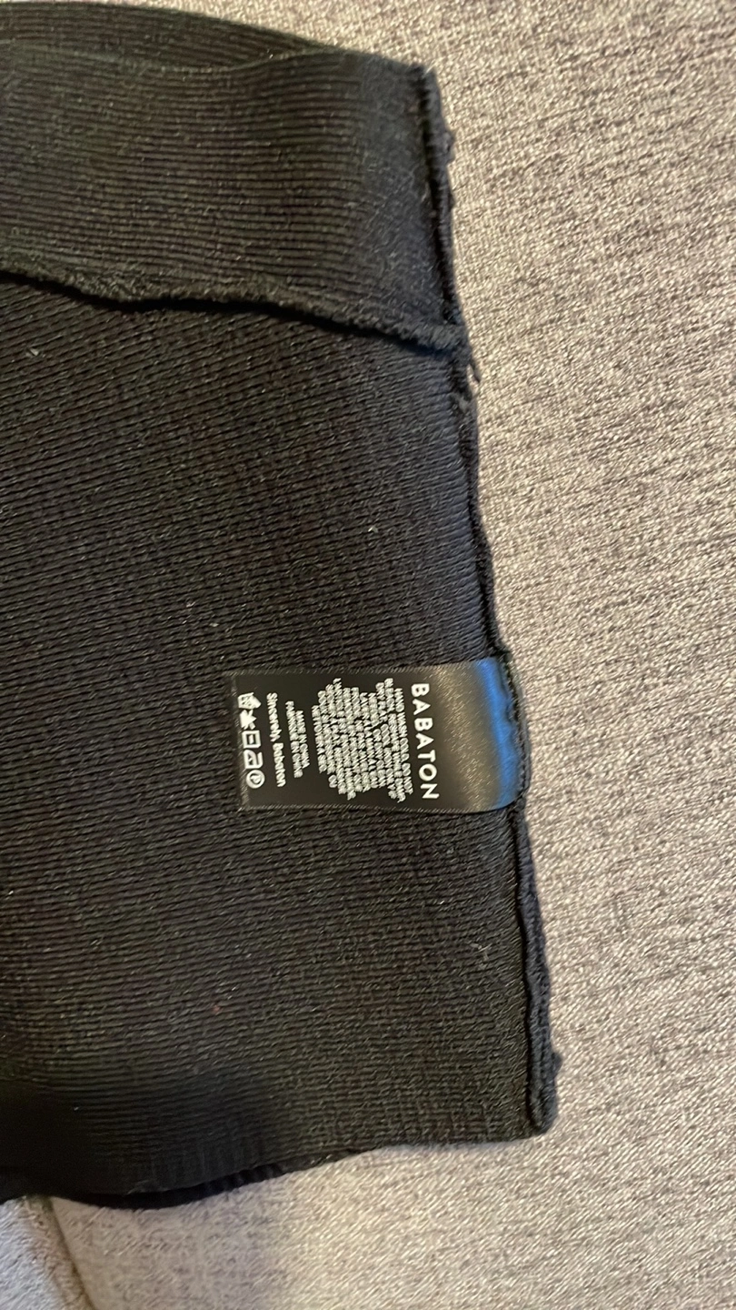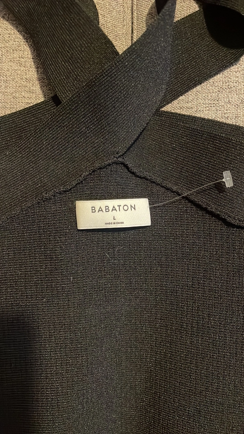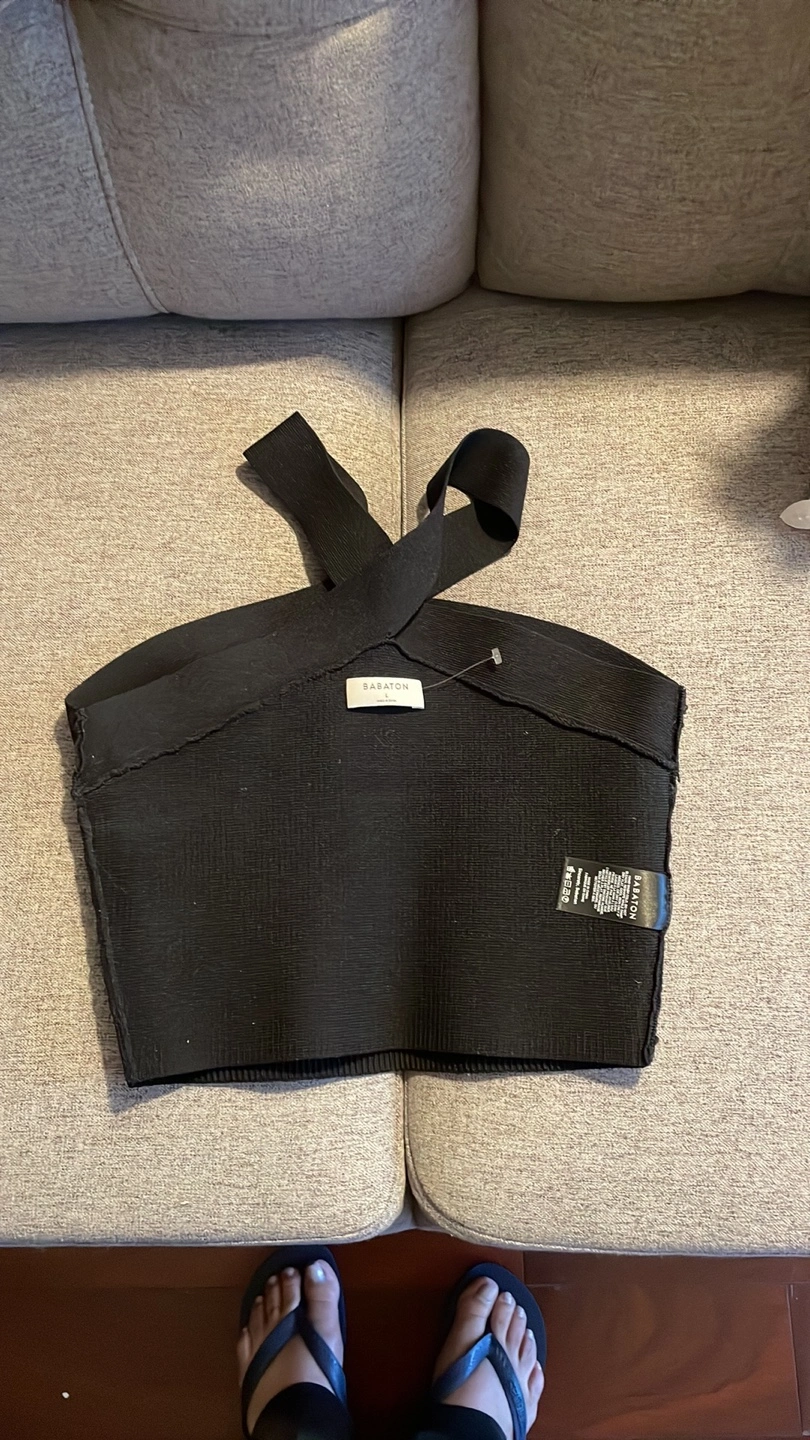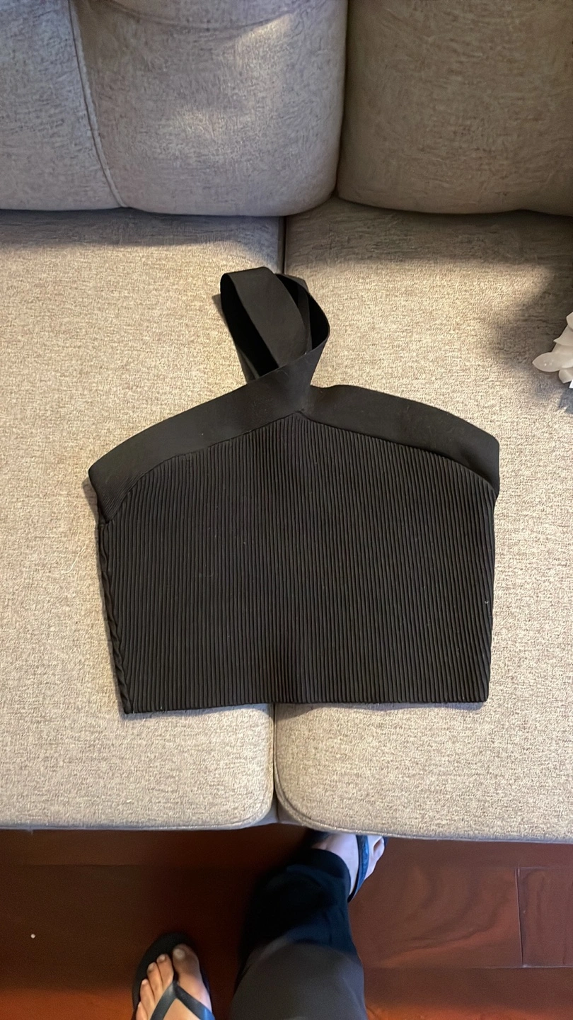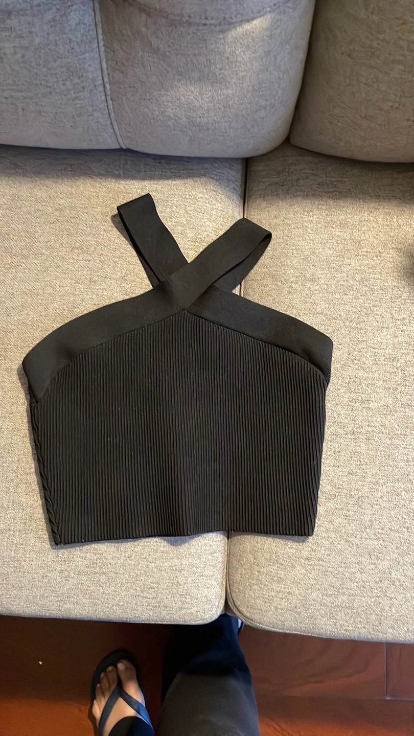 291Black ribbed knit crop top. Halter neck design with crossover straps. Size Large. Made in China.