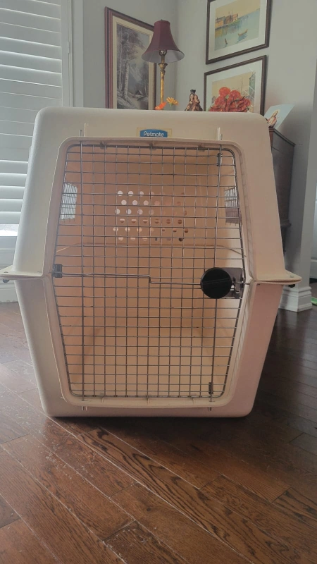 Airline approved and durable plastic dog crate. Off-white colour. Metal door and ventilation. Suitable for medium to large dogs. Good condition.