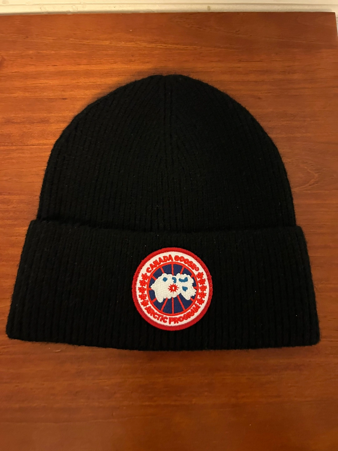 126Black ribbed knit beanie. Features a classic Canada Goose logo patch. UA rep