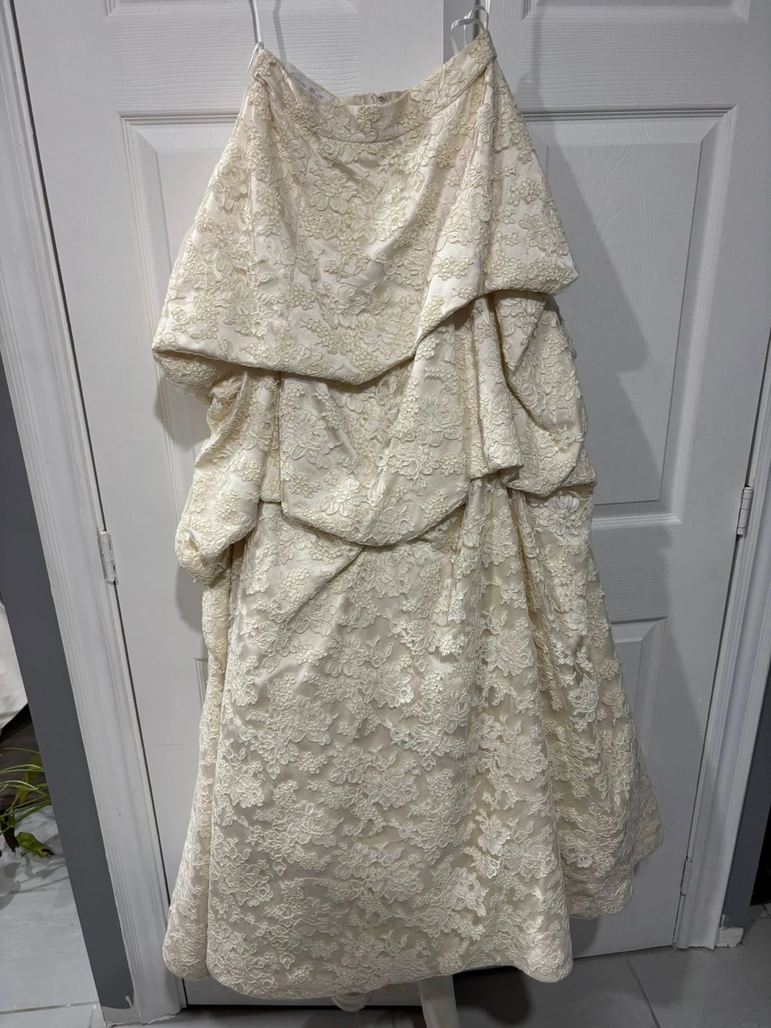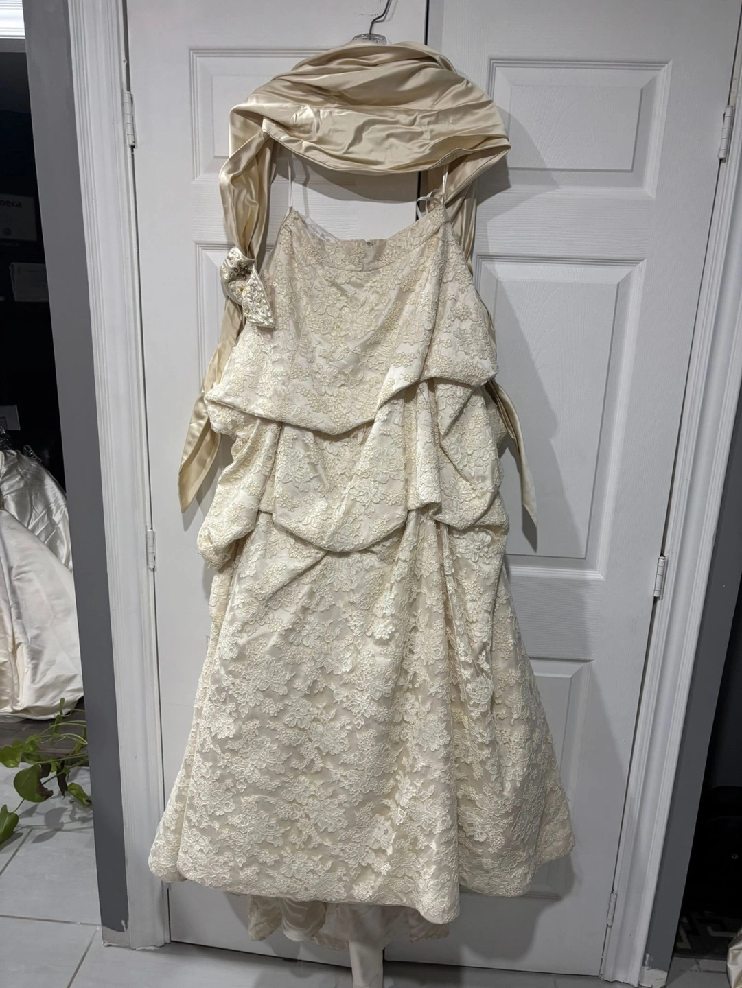 Stunning ivory lace wedding dress. Floor-length A-line silhouette. Features layered ruffles and delicate beading. Includes matching satin sash.