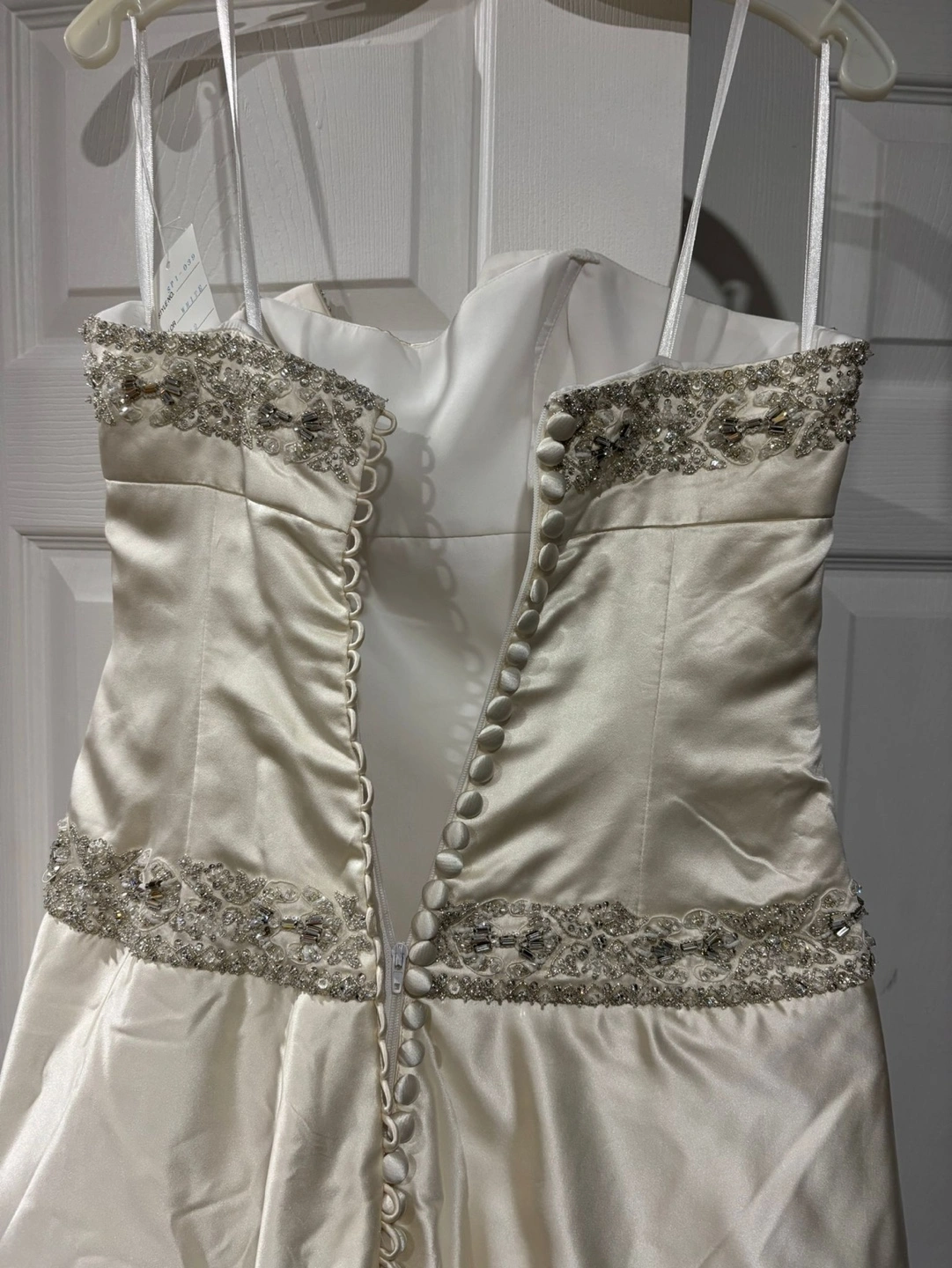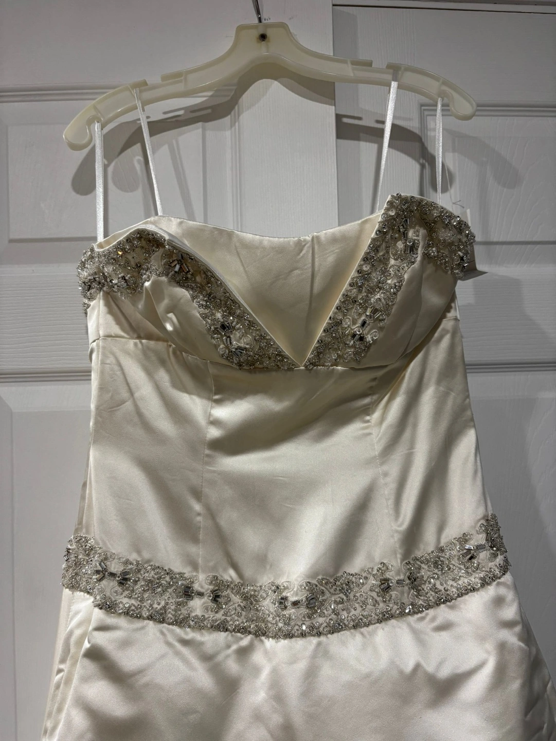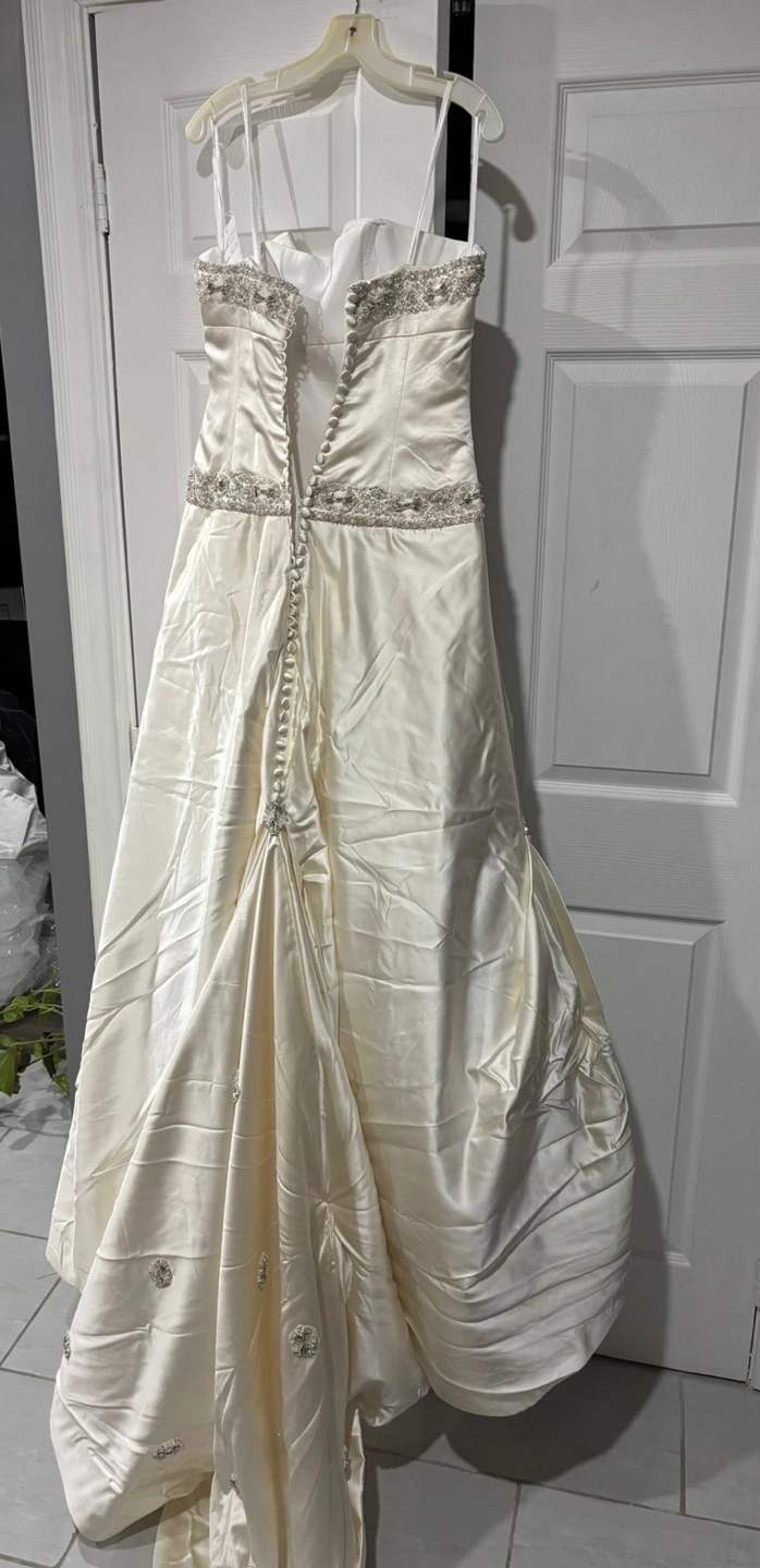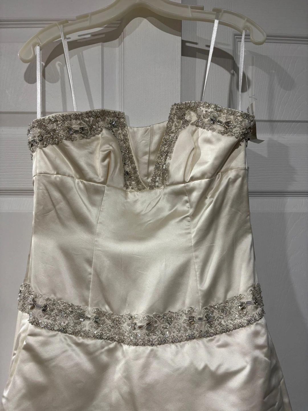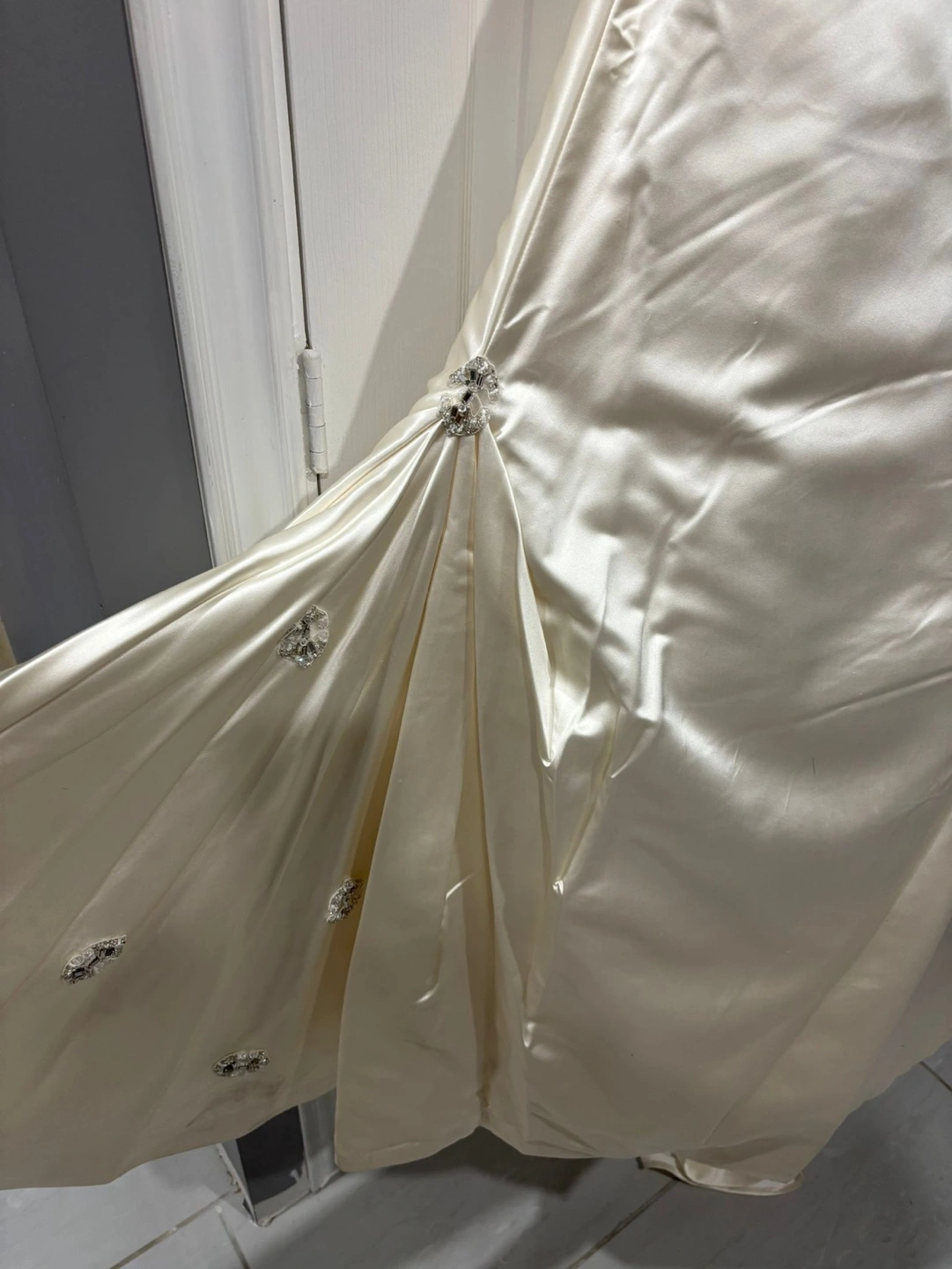 Stunning ivory satin A-line gown. Features a sweetheart neckline and beaded bodice. Button closure at the back. Floor-length. Elegant and timeless.