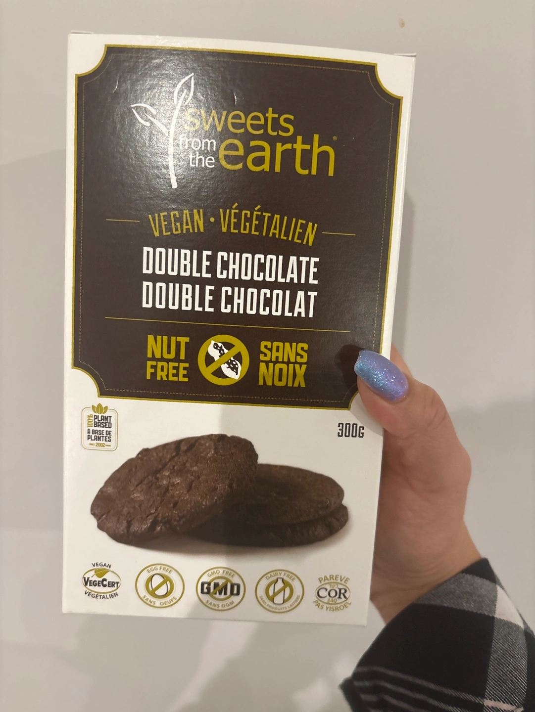 300g box of vegan double chocolate cookies. Nut-free, egg-free, dairy-free, and GMO-free. Pareve.