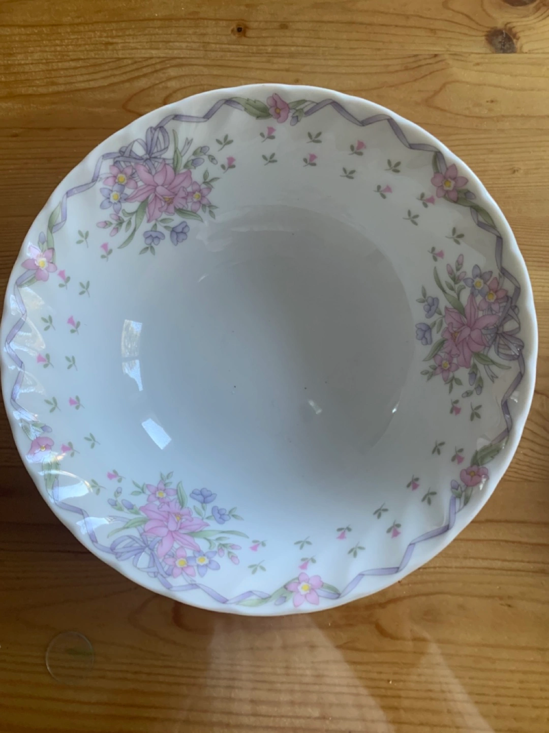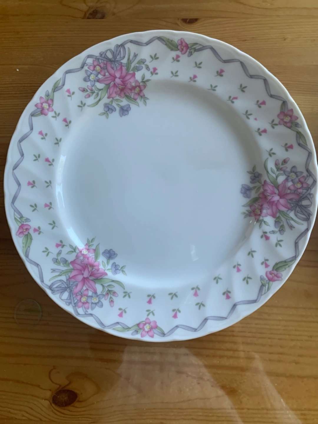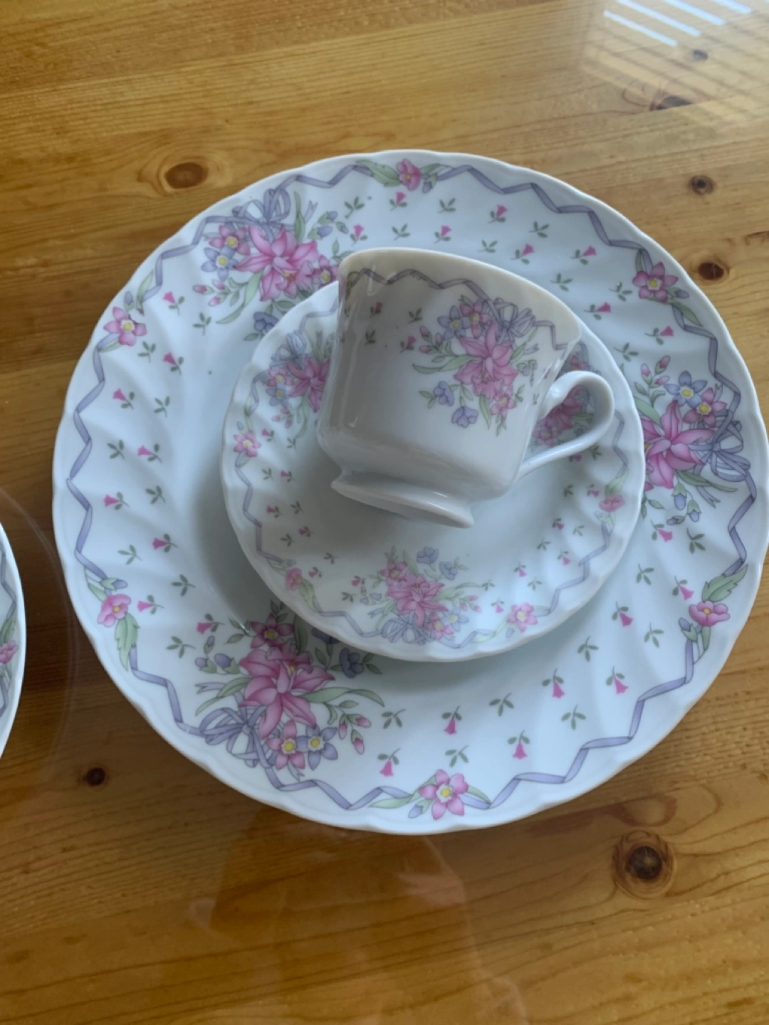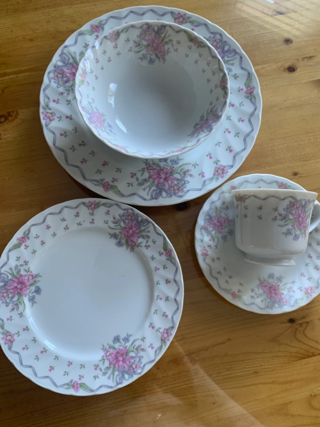 Beautiful floral dinnerware. Includes dinner plate, salad plate, soup bowl, teacup and saucer. Pretty pastel colours. Excellent for everyday use or special occasions.