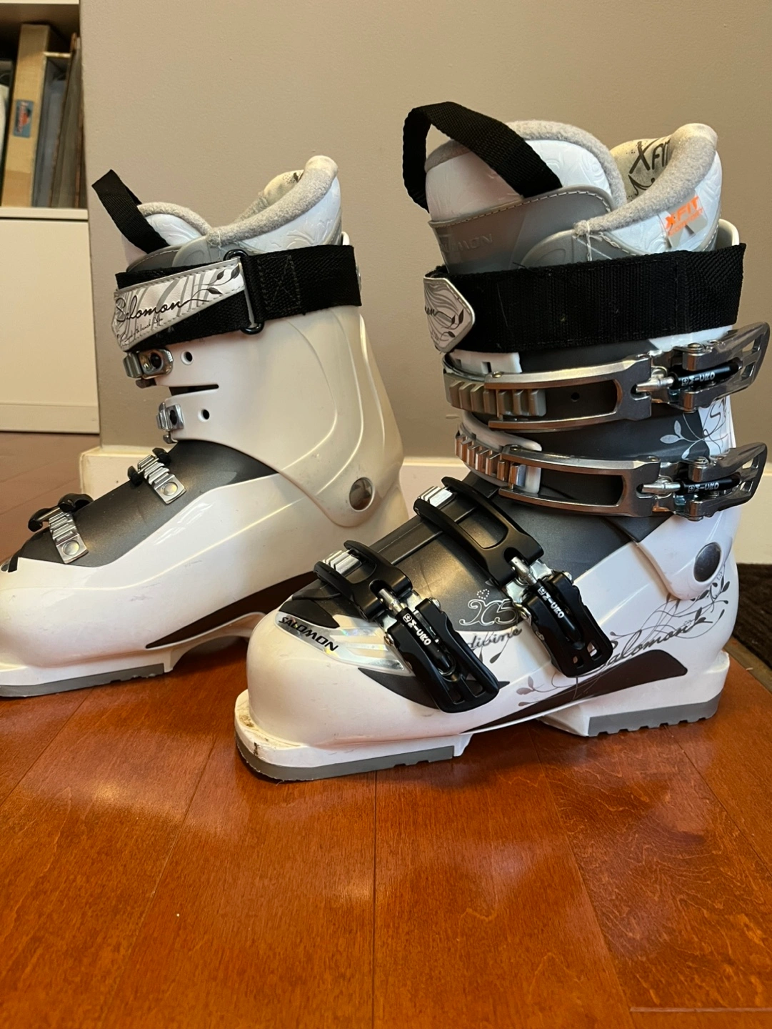 Used all mountain Salomon women's ski boots. White and grey. Four buckles. Good condition. Size 24, women’s shoe size 7. Great, comfortable boot. Only selling because they are outgrown.