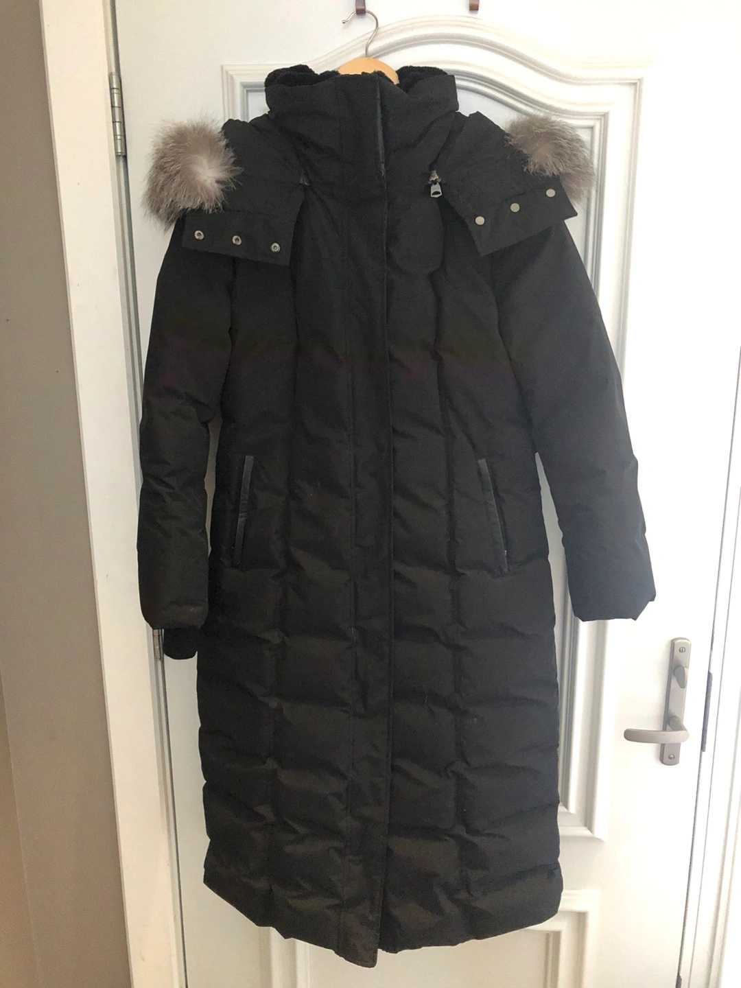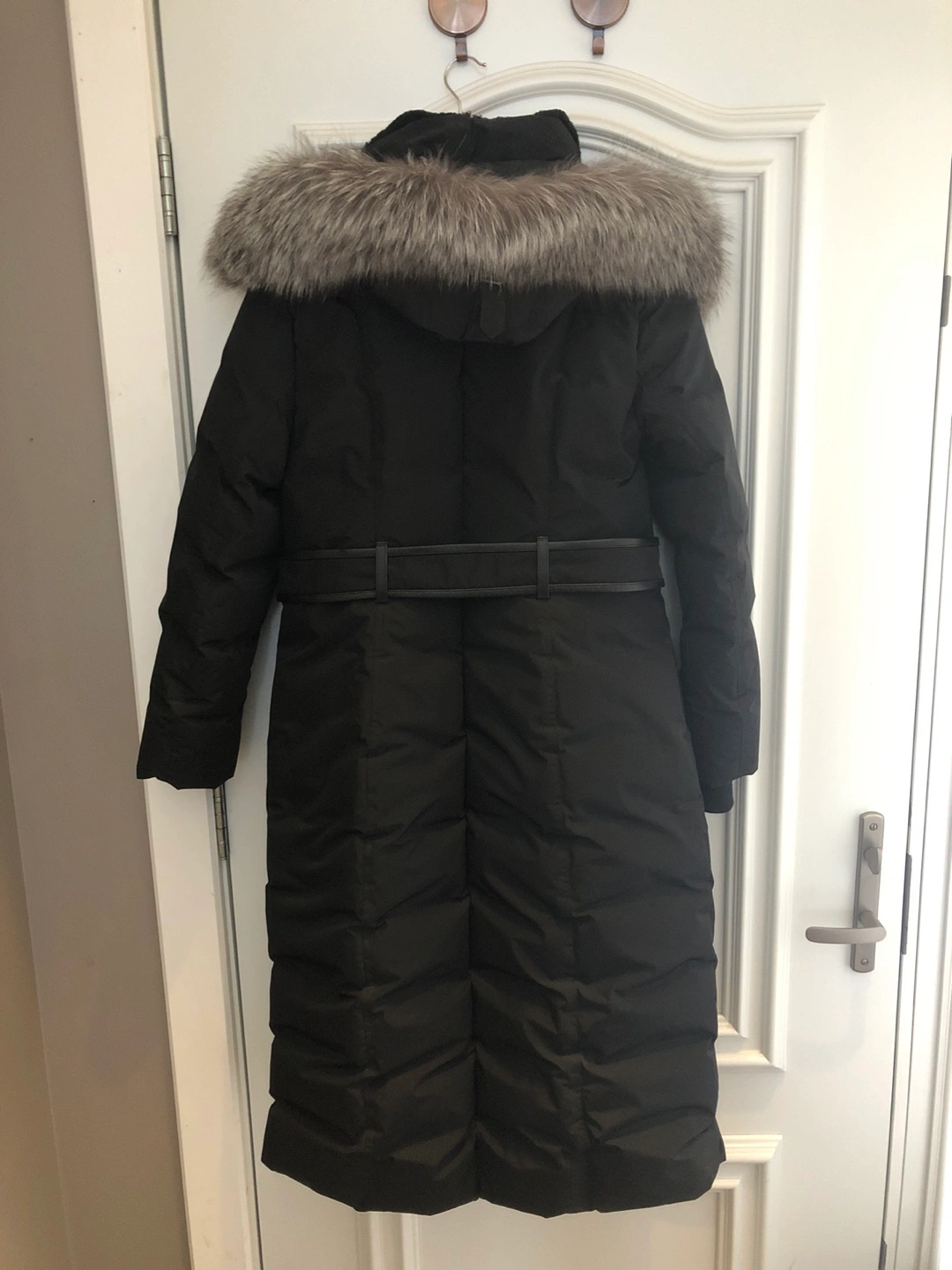 Long black puffer coat. Features a faux fur-trimmed hood and a belted waist. Excellent for winter. Size XL/TG.
