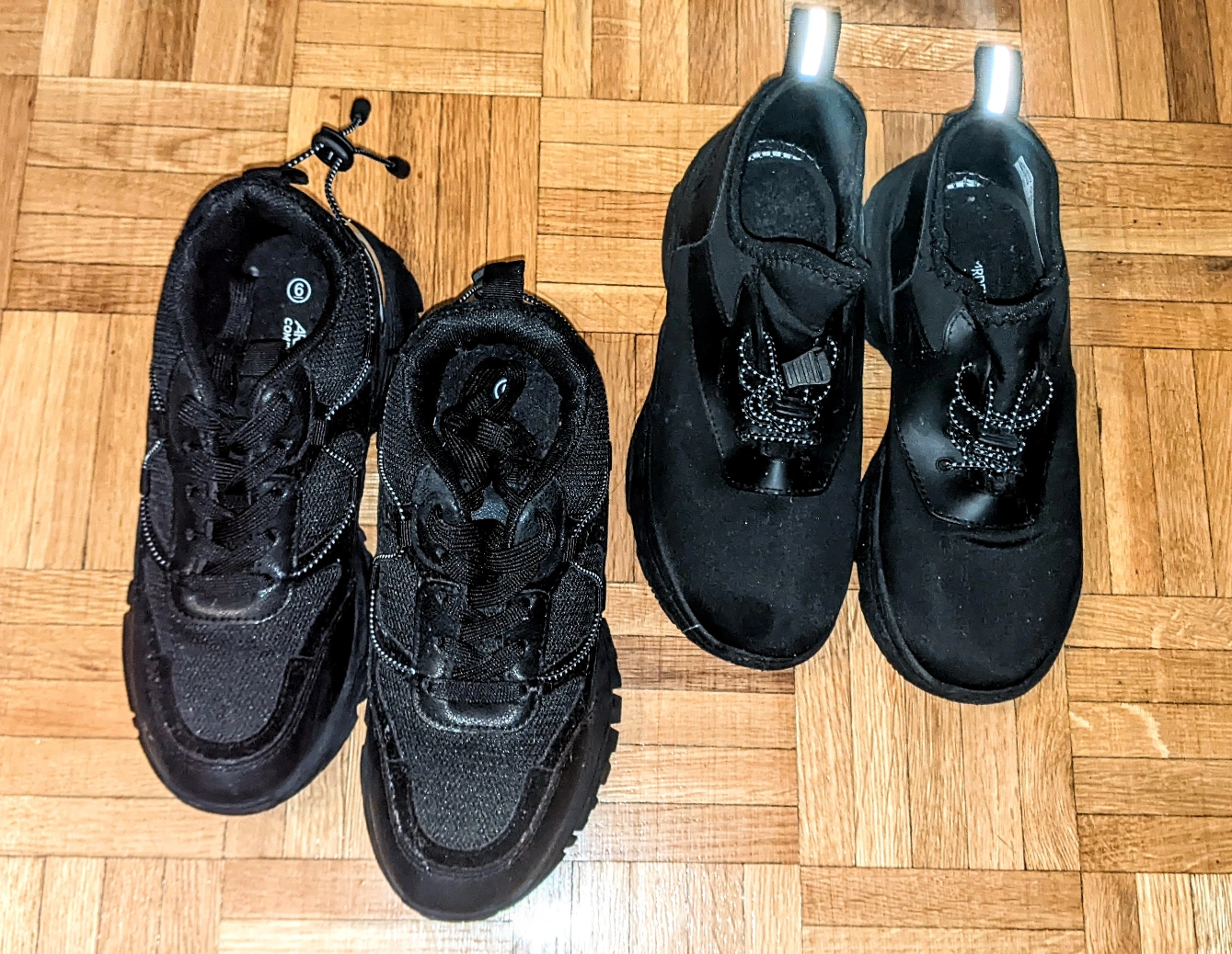 Two pairs of black Ardene sneakers. One pair has laces, one pair has a pull-on design. Chunky platform soles. Good for everyday wear.