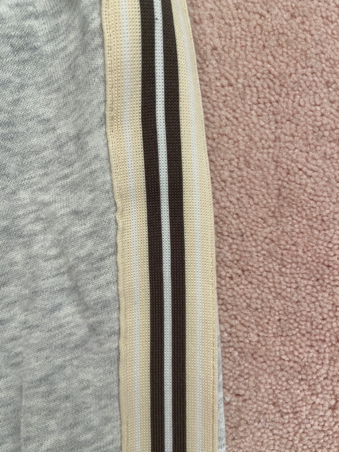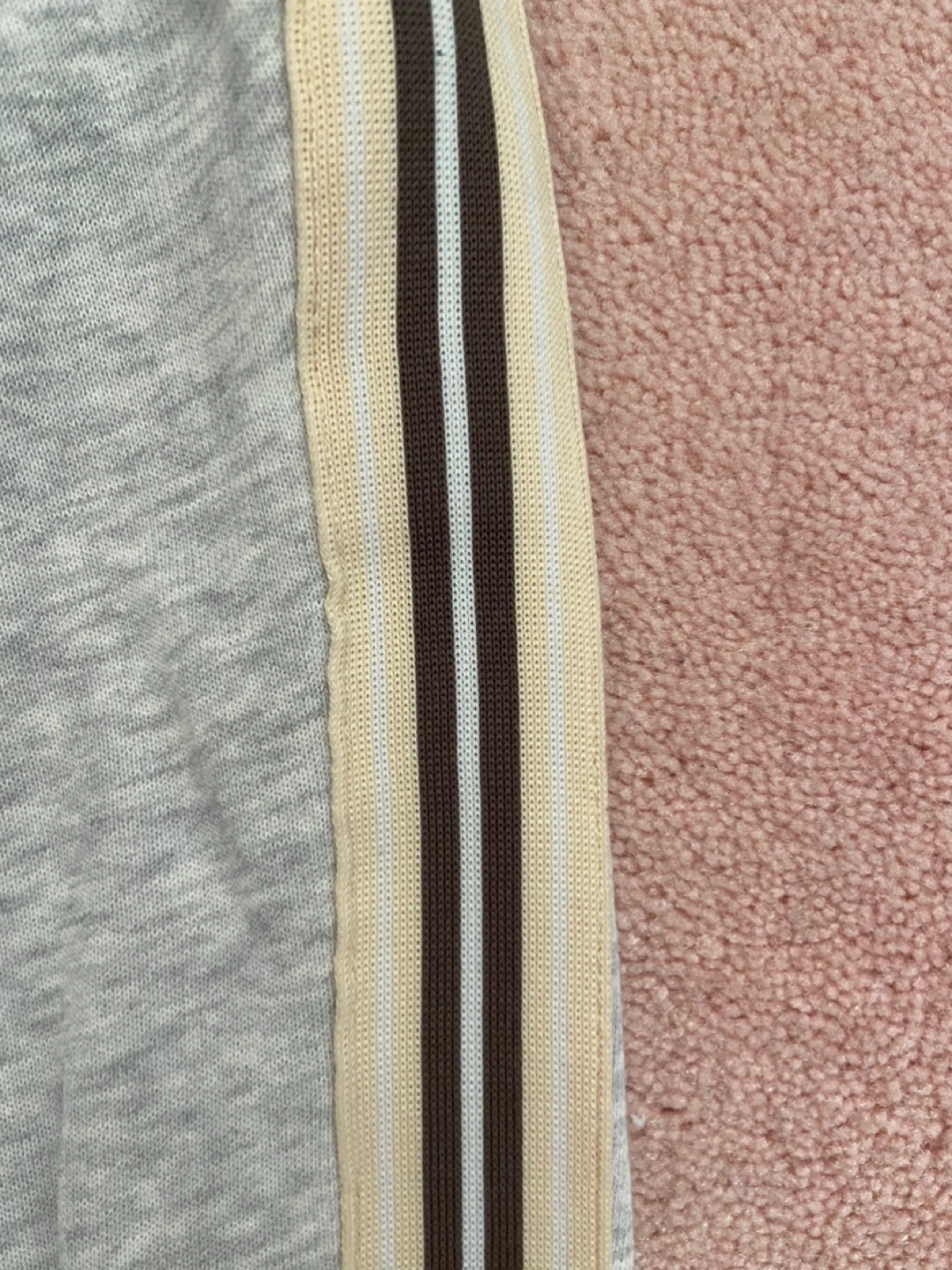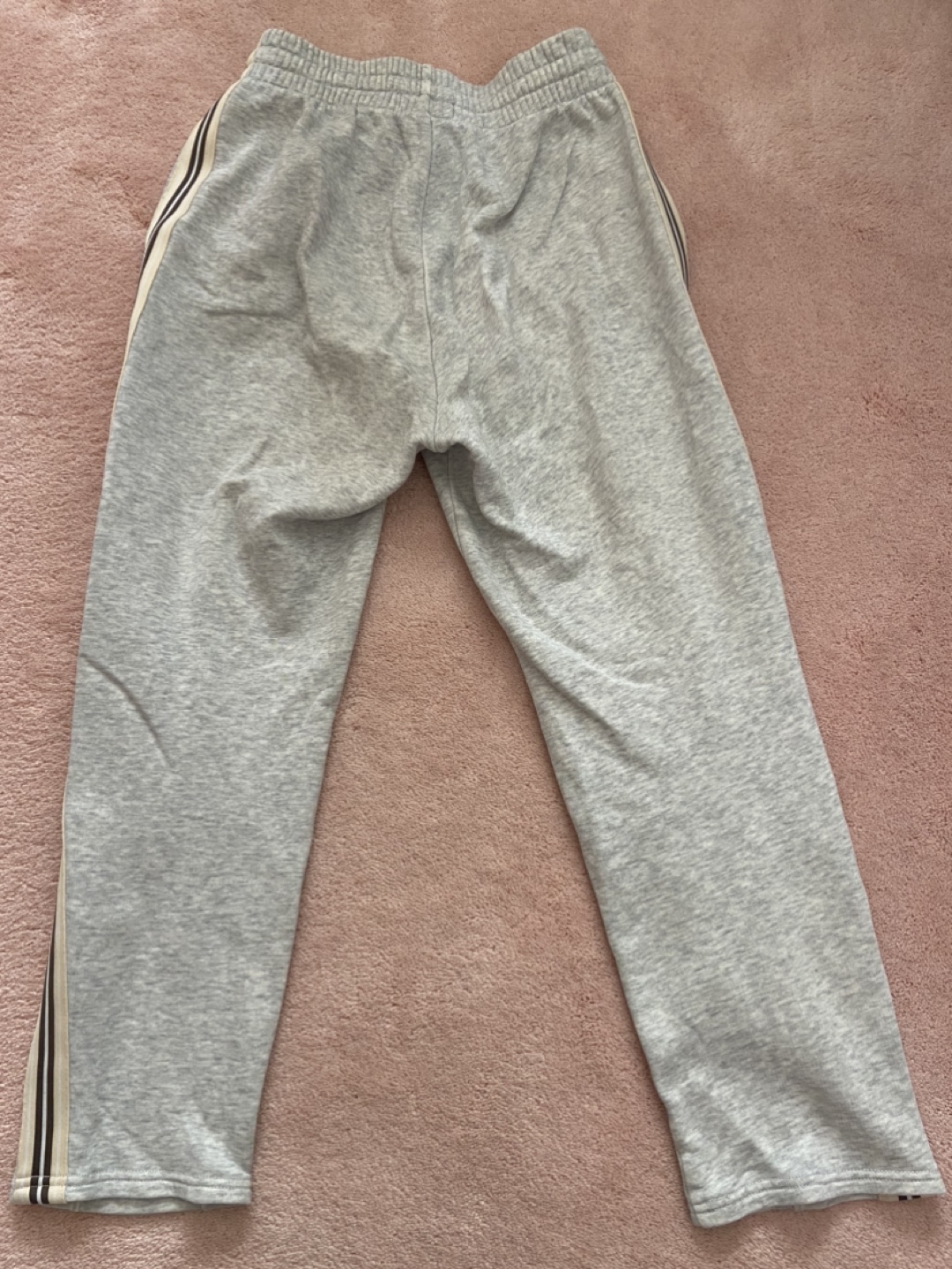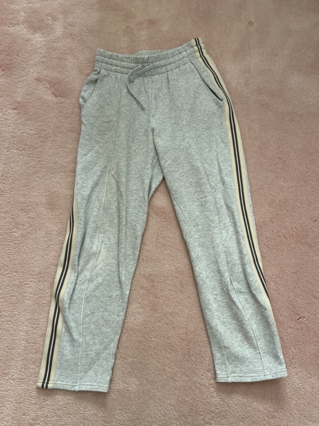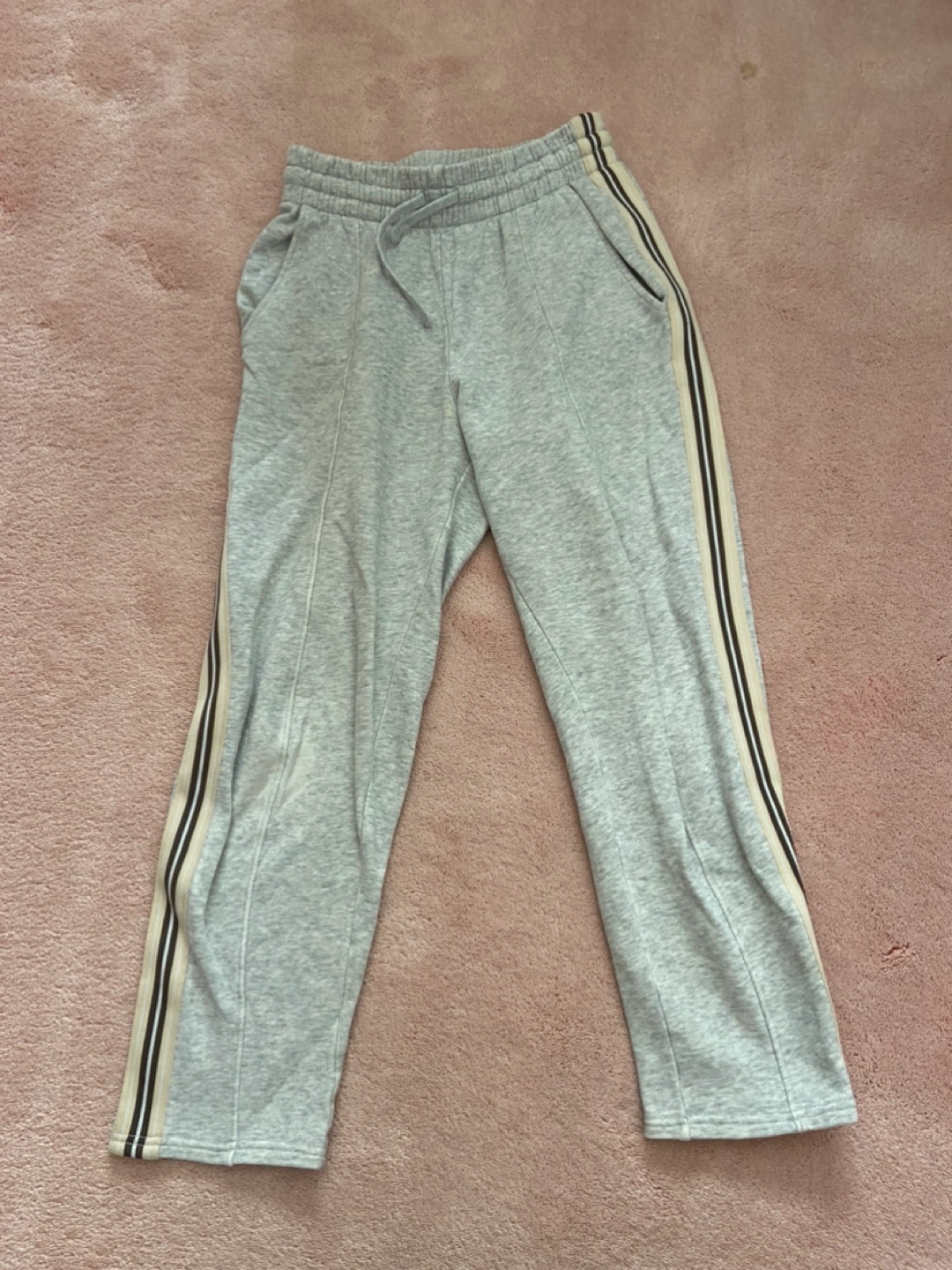 Grey sweatpants, size XXS. Features side stripes in cream and brown. Elastic waistband and drawstring. Pockets on the sides.