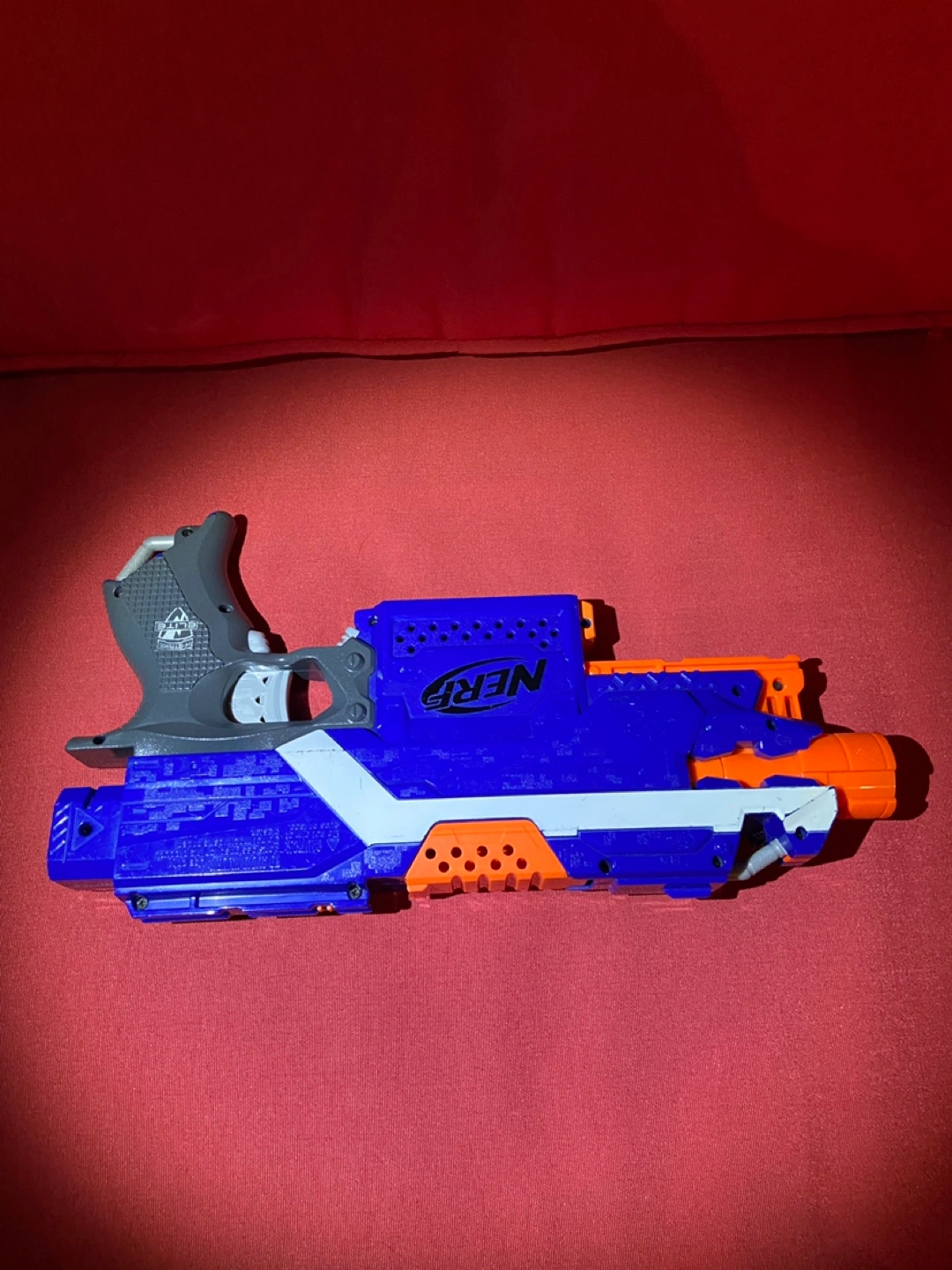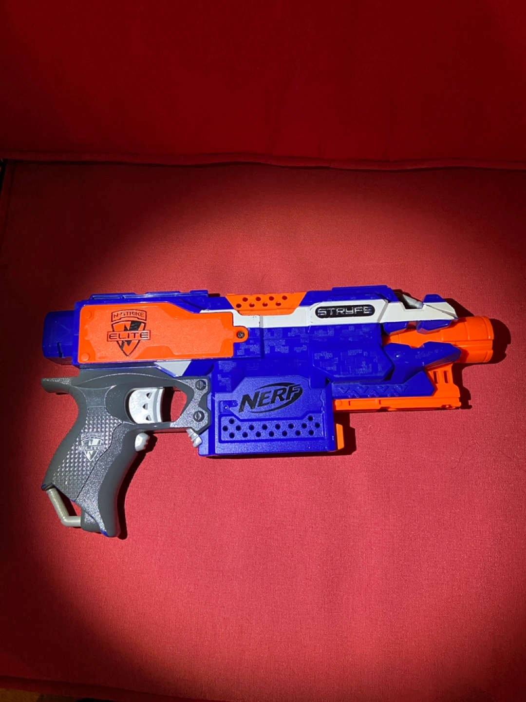 Semi auto Nerf Elite Stryfe blaster. Blue, white, and orange colours and battery powered, accurate at medium range shots. Used condition