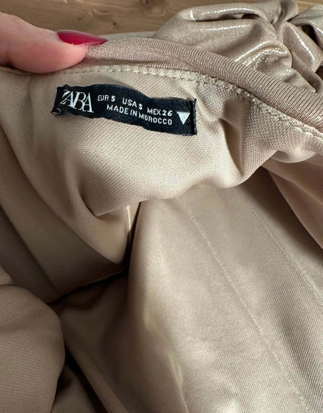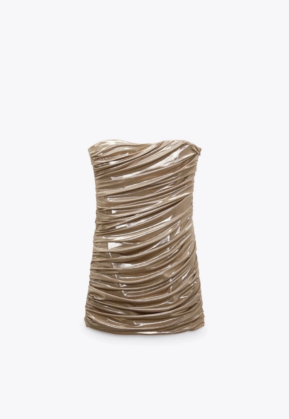 Stunning strapless mini dress. Features a ruched design and metallic gold fabric. Size small.