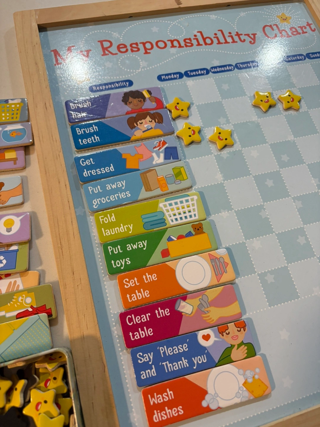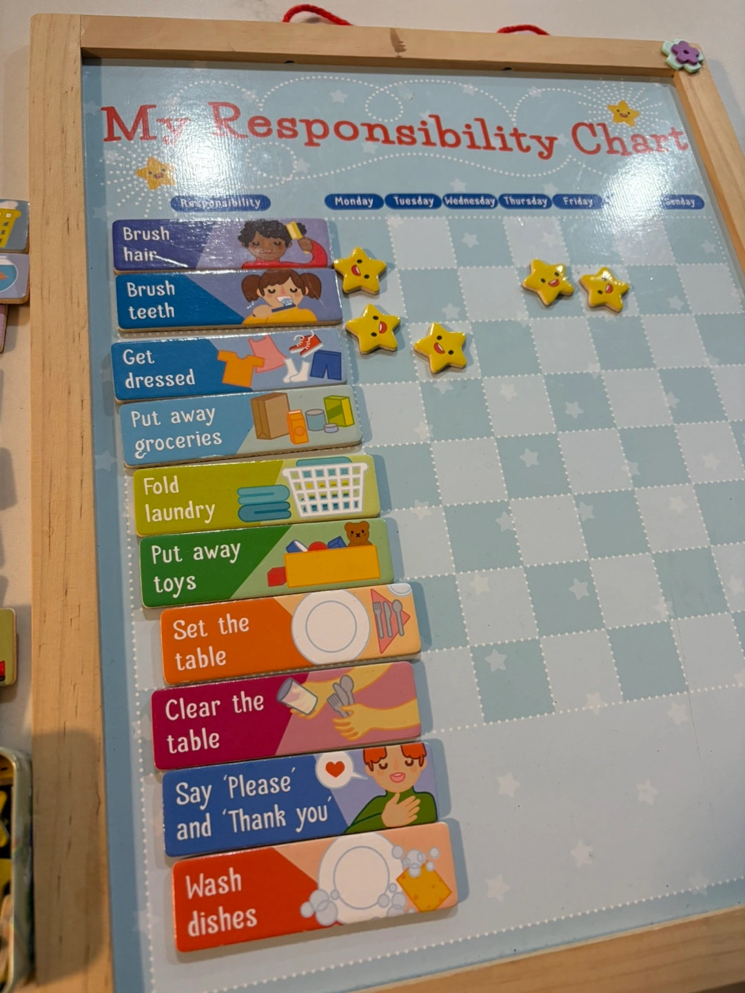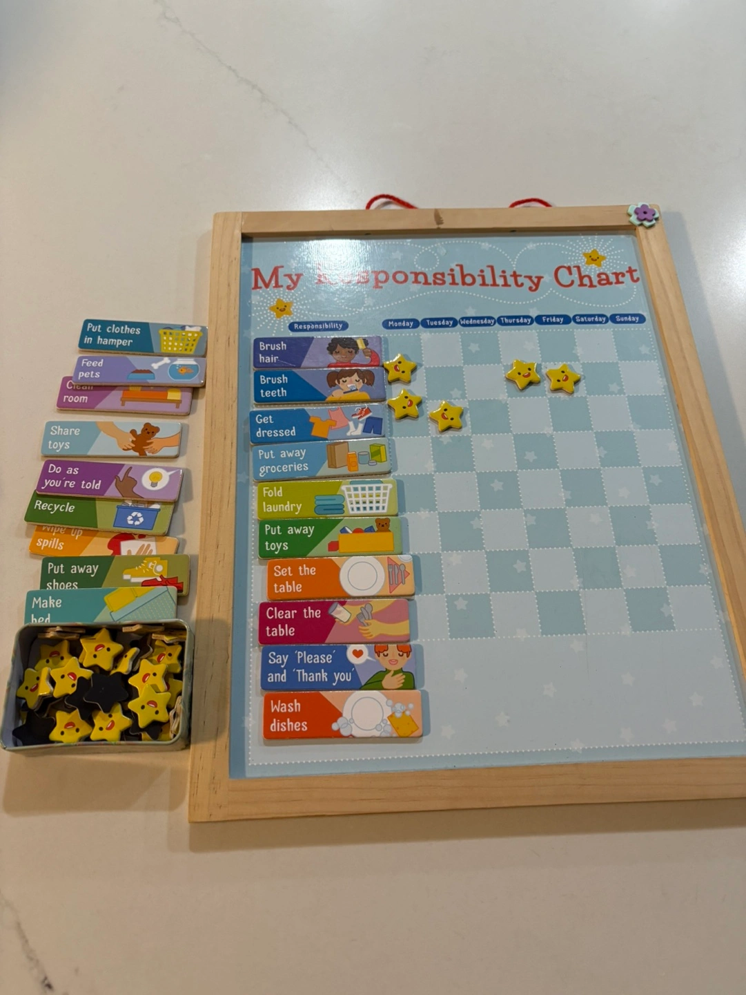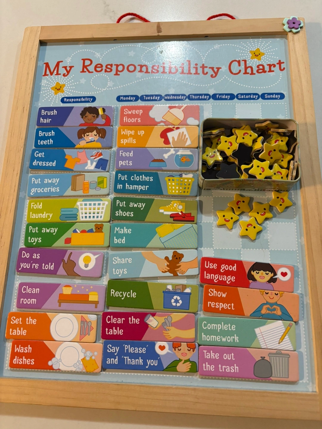 Reusable chore chart. Wooden frame. Includes magnetic task cards and star tokens. Great for teaching kids responsibility.