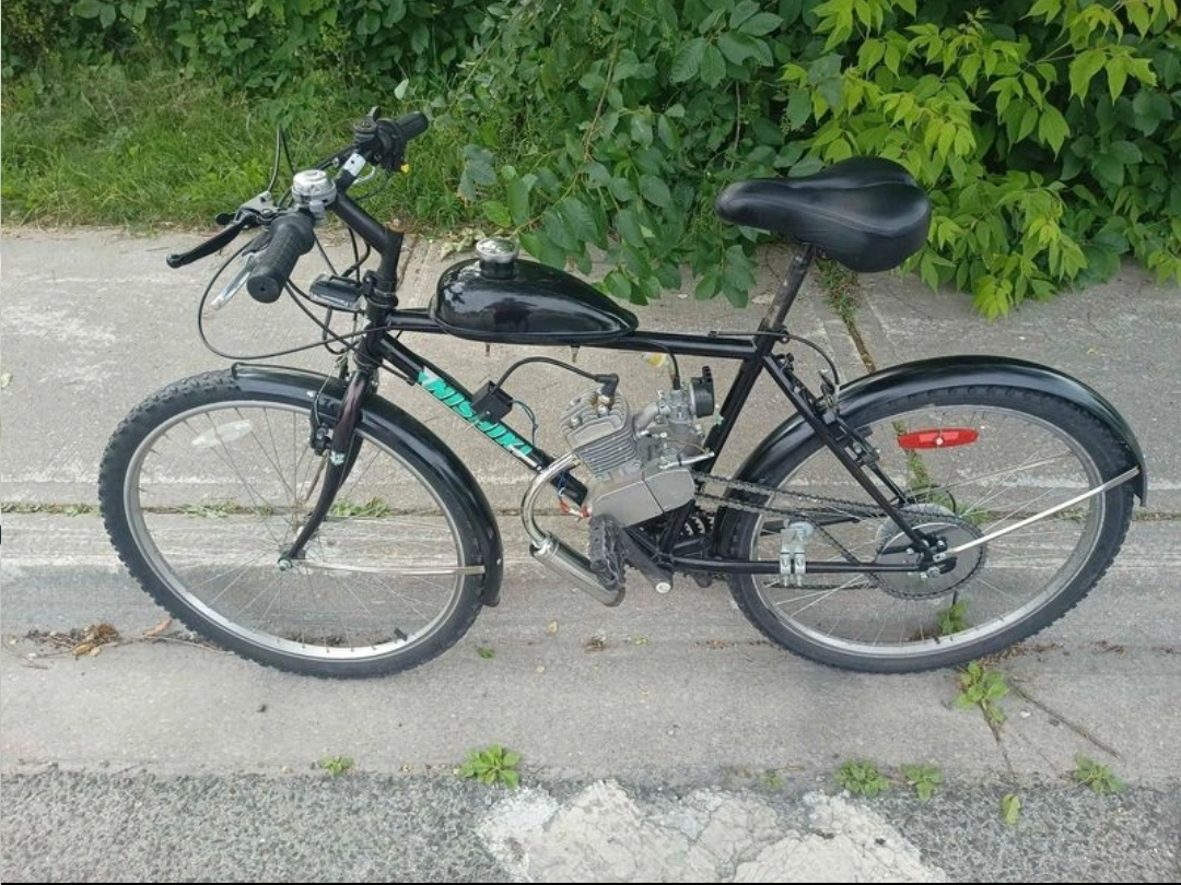 Selling my black motorized bicycle with a small gas engine (engine needs repair due to cold climate). It was kept outside, and the cold got to it, but the rest of the bike is in good shape.