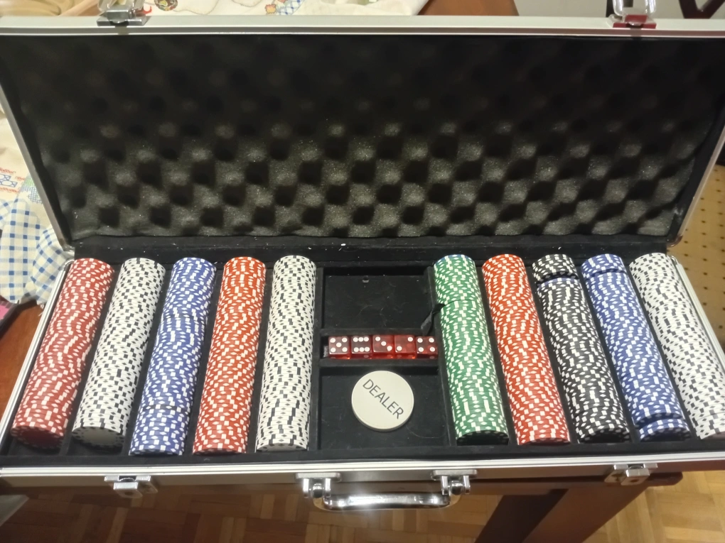 Aluminum carrying case. Contains multiple colours of poker chips and five dice. Ideal for poker games.