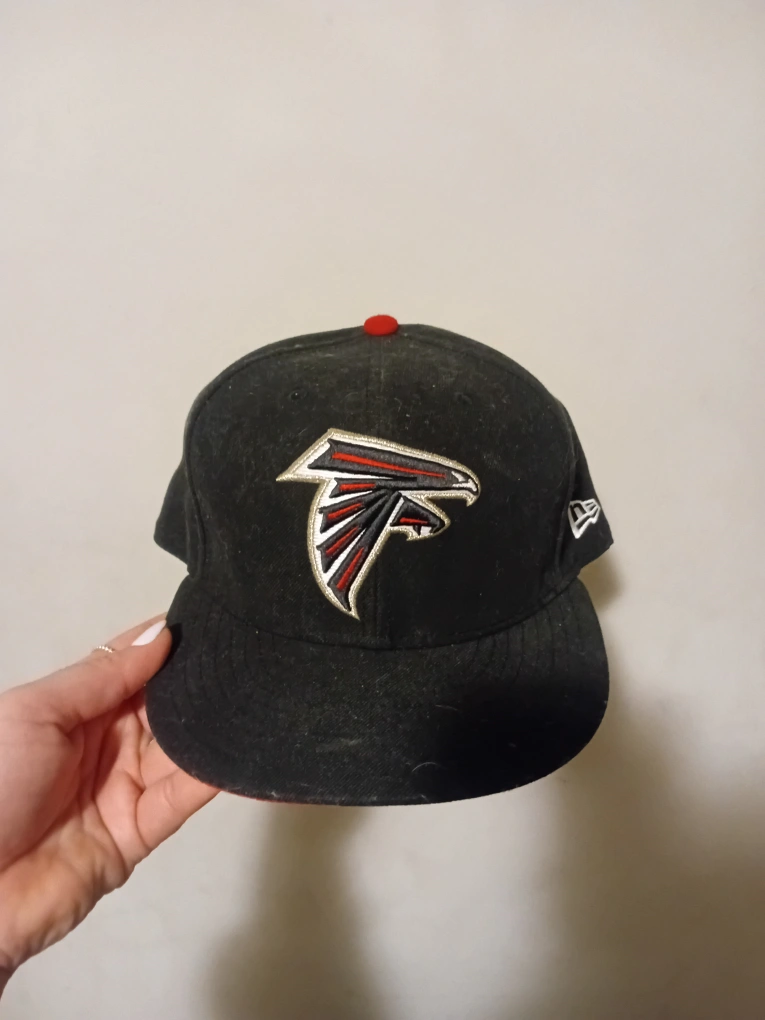 Black Atlanta Falcons fitted hat. Features team logo and NFL shield. Size 7 1/8 (60.6cm). New Era brand.