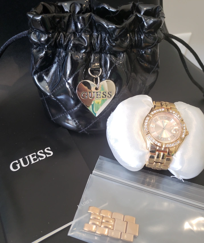 Currently strap has been adjusted to a small wrist but have the original extra link pieces, you can bring to a guess shop to cutomize the length. minor scratches present. Battery needs to be replaced. see minor imperfection black mark from the black storage bag.
