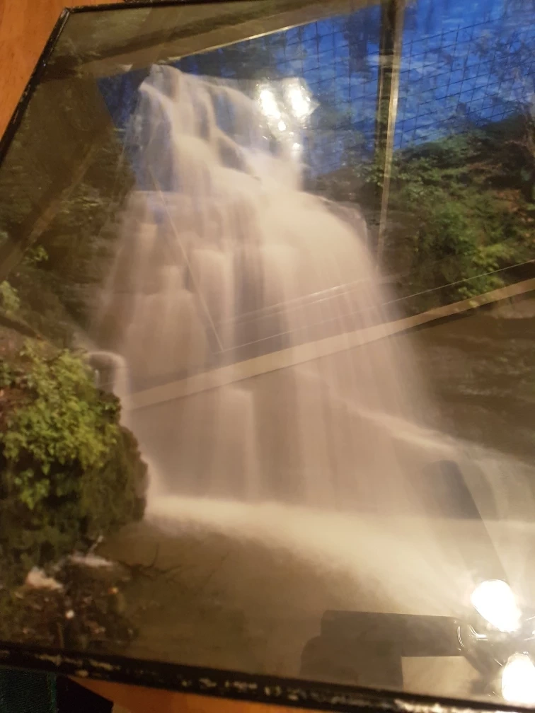 Beautiful framed photograph of a waterfall. Glass-covered frame. Perfect for adding a nature-inspired touch to your home decor.