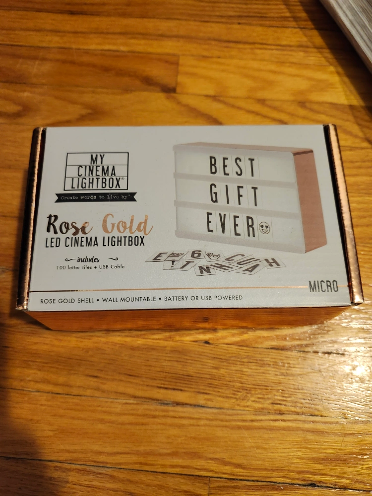 LED Cinema Lightbox. Rose gold shell. Wall mountable. Battery or USB powered. Includes 100 letter tiles and USB cable.