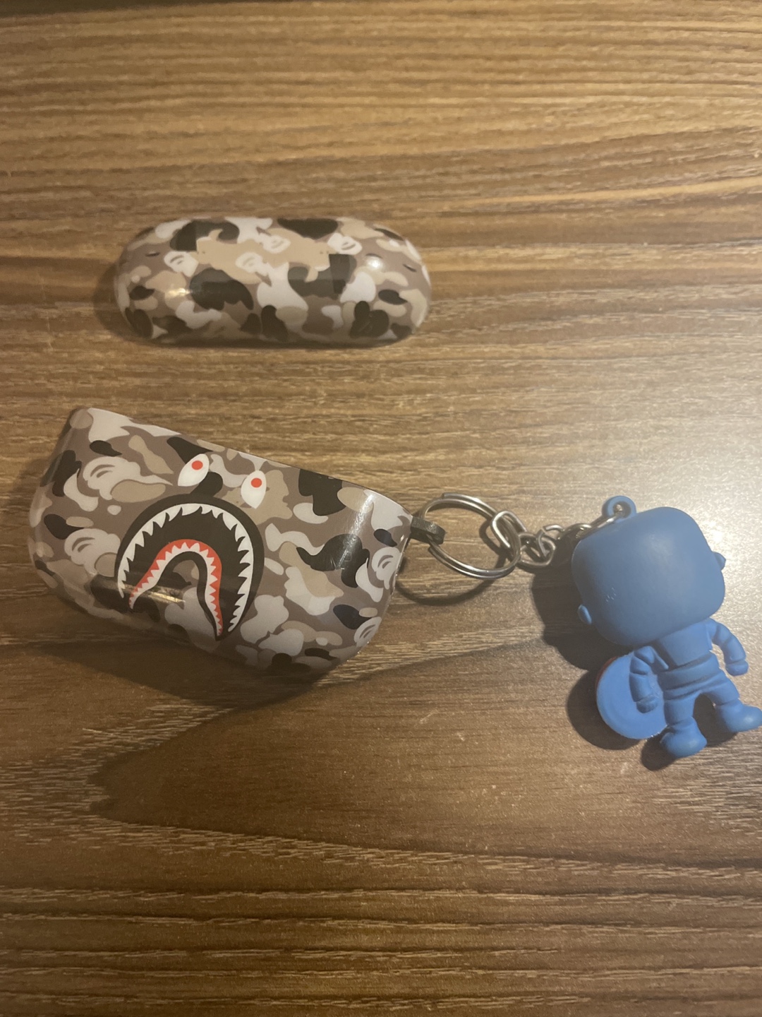 Airpod case with camo print. Includes a blue keychain figure. Slightly used.