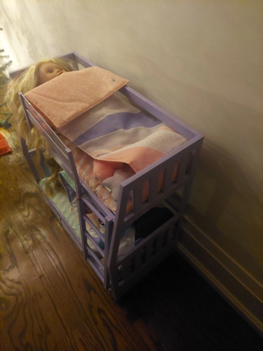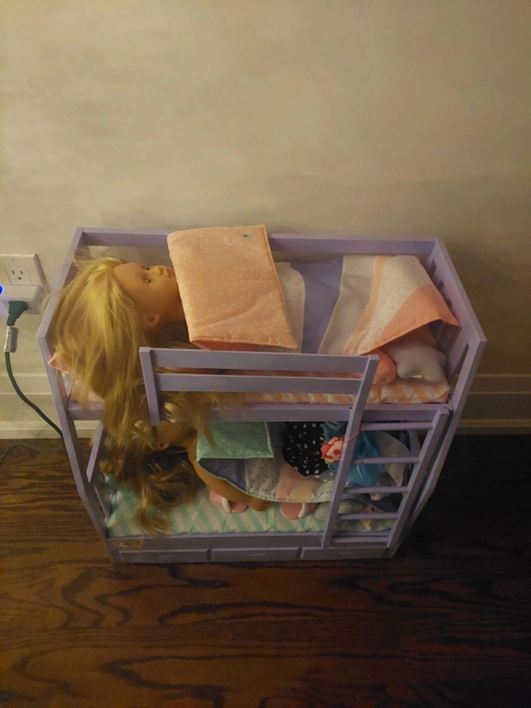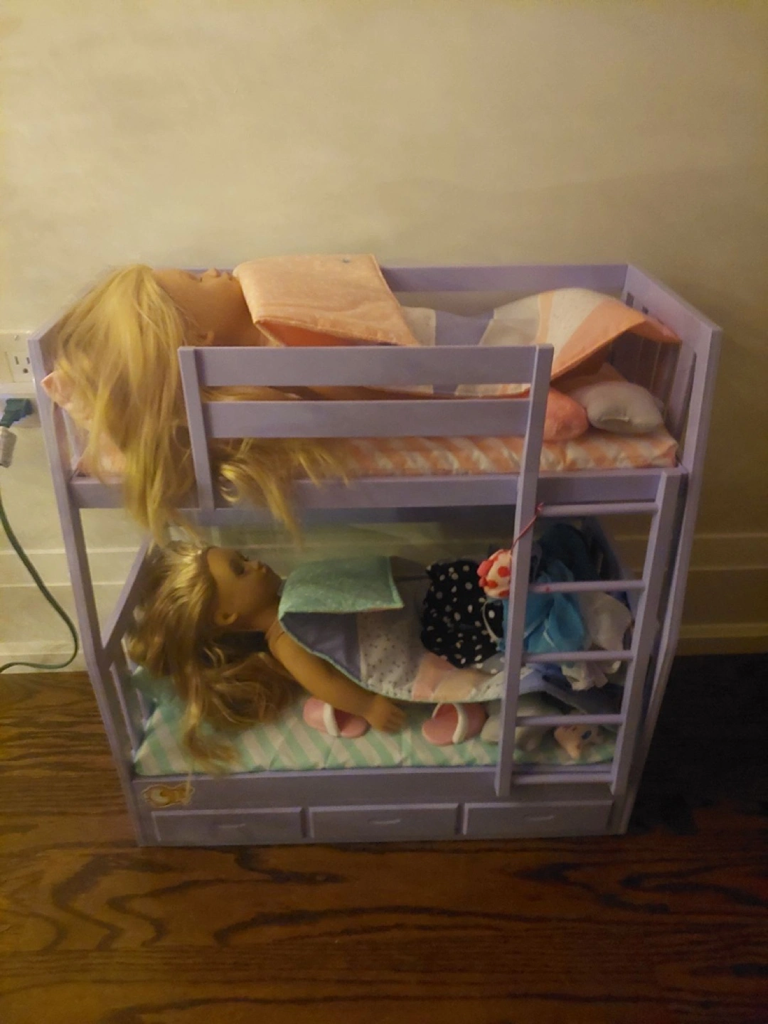 Lavender bunk bed for dolls. Includes bedding and pillows. Suitable for 18-inch dolls. Good used condition.American Girl dolls