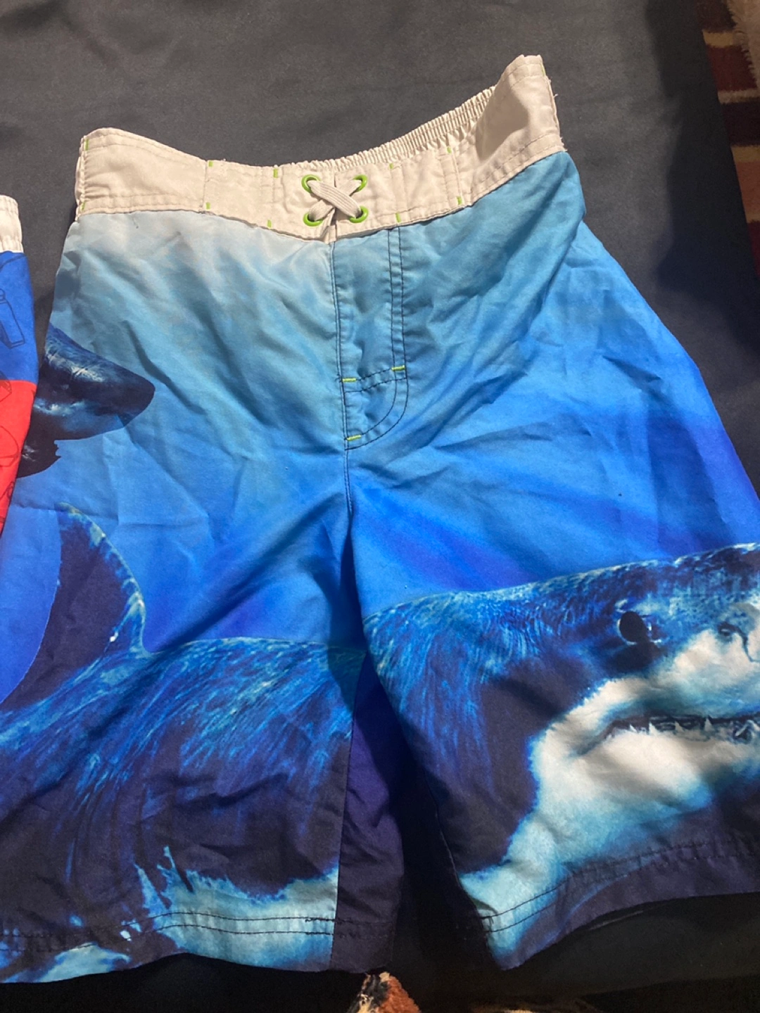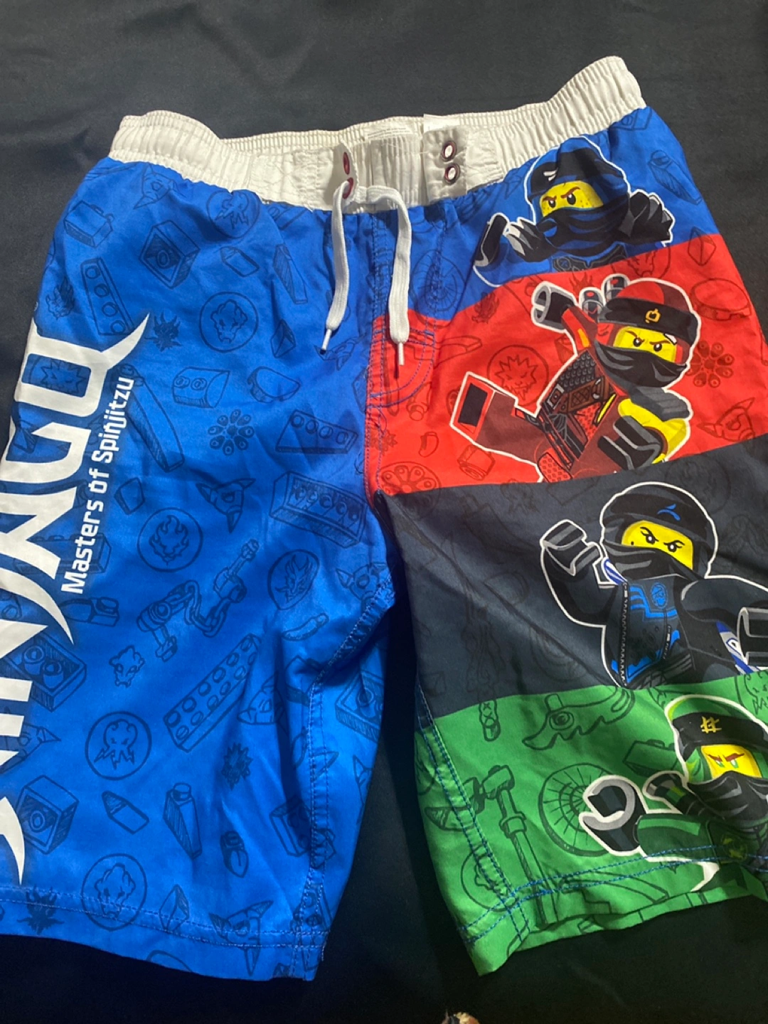 Two pairs of boys' swim trunks. One features a shark design, the other features a LEGO Ninjago design.size 7-8 and second one large size for boysElastic waistband with drawstring. Excellent condition.