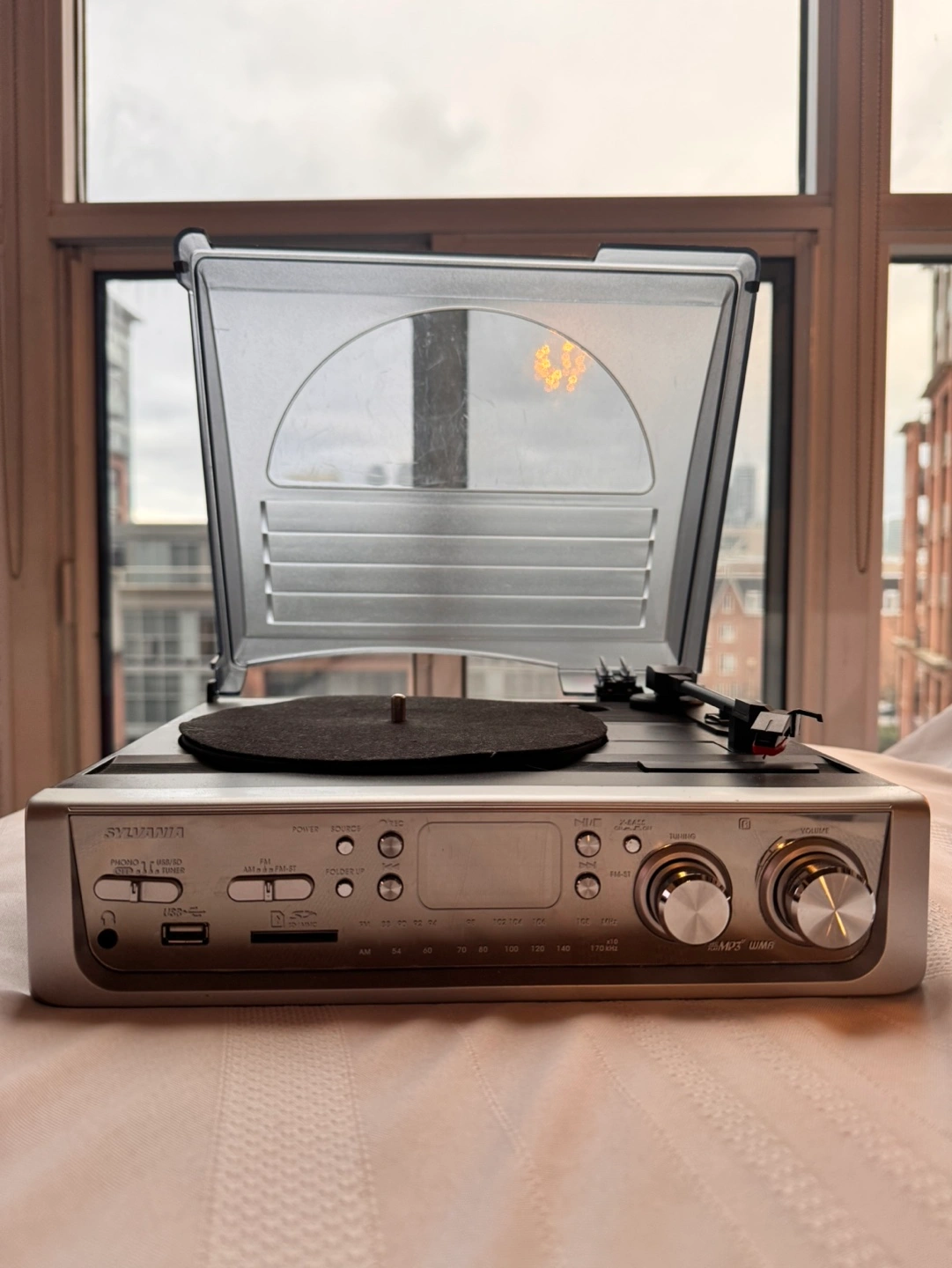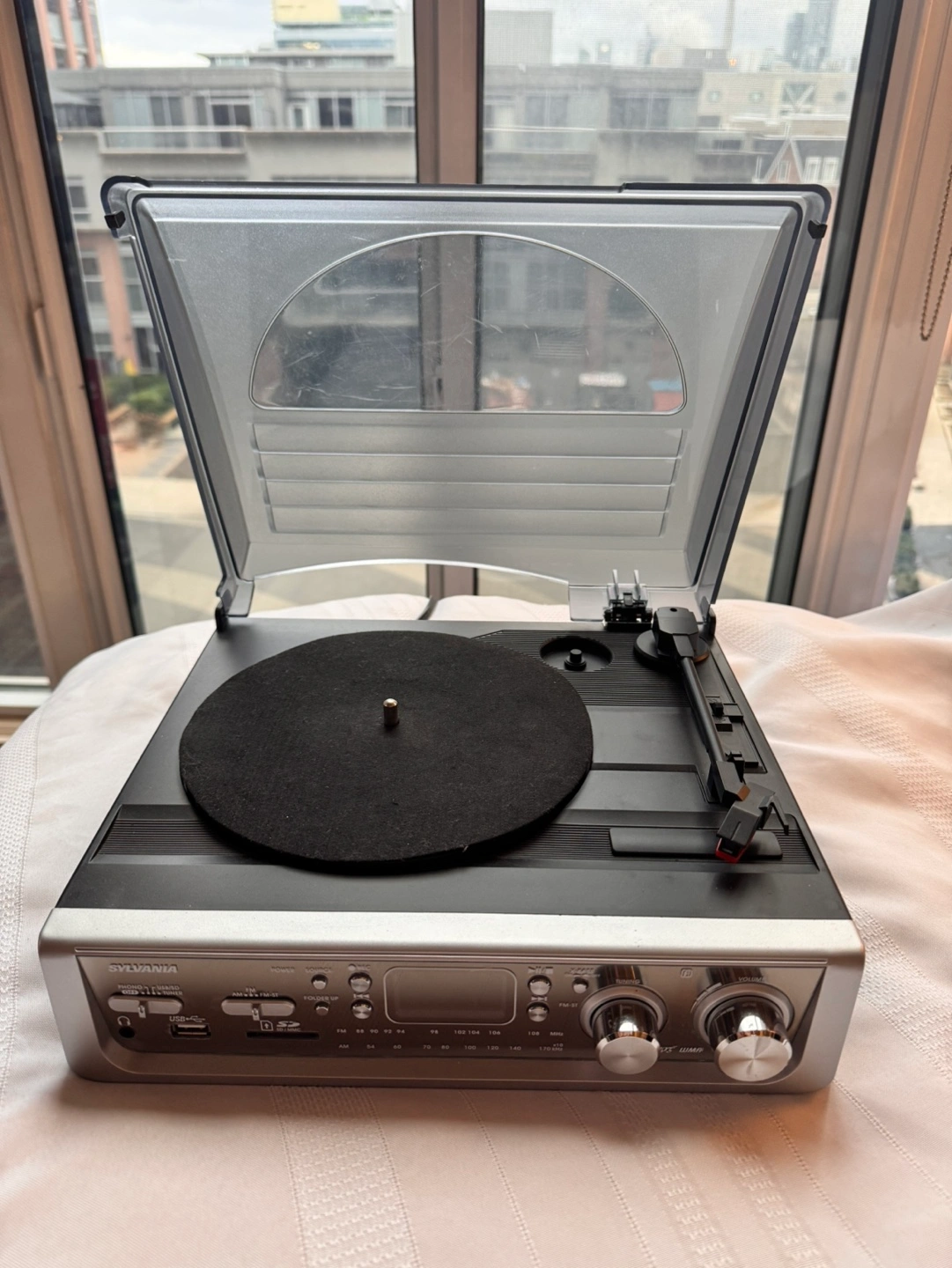 Vintage Sylvania turntable. Plays vinyl records. Features stereo radio, USB and SD encoding. Includes remote control and instruction manual. Excellent condition.