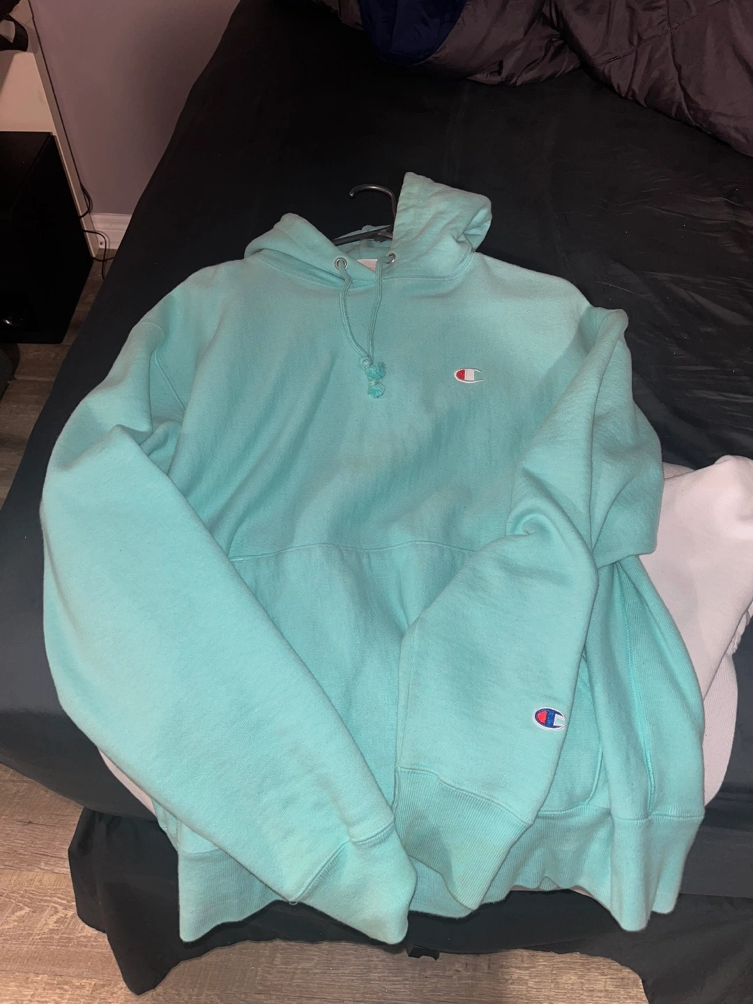Men's Champion Reverse Weave hoodie. Light teal colour. Great condition. Small logo on chest and sleeve, great condition!
