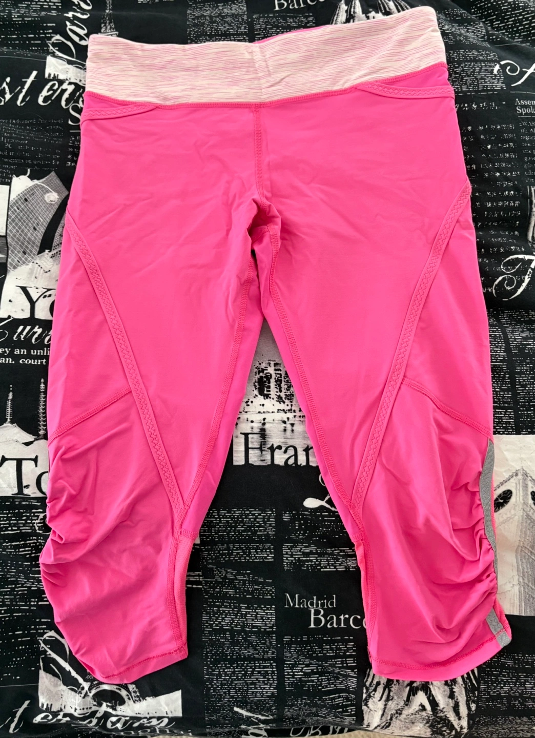 Pink running crops. Size 6. Features a white and pink waistband. Excellent for workouts.