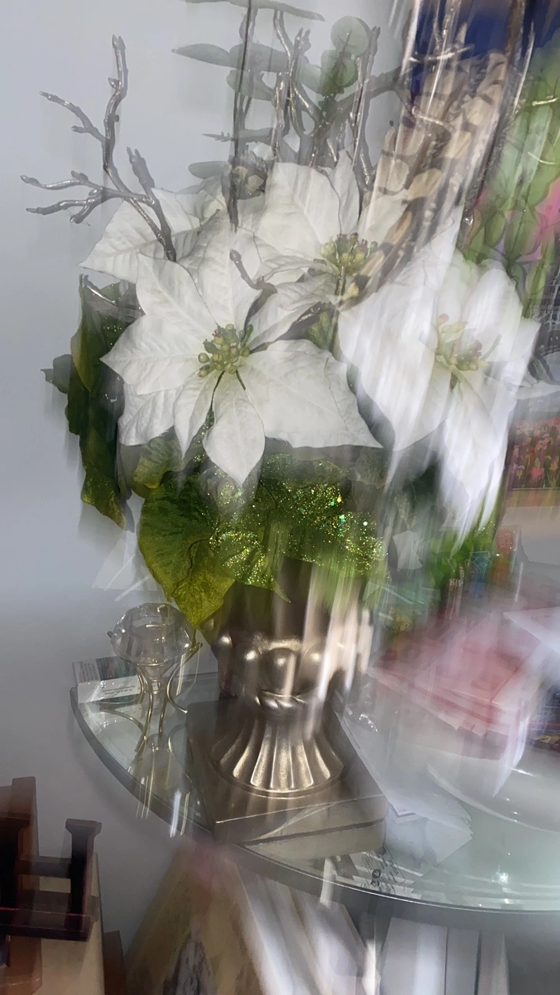 Beautiful artificial poinsettia arrangement. Features white poinsettias, silver branches, and green glitter accents. Gold coloured urn included. Festive holiday decor.