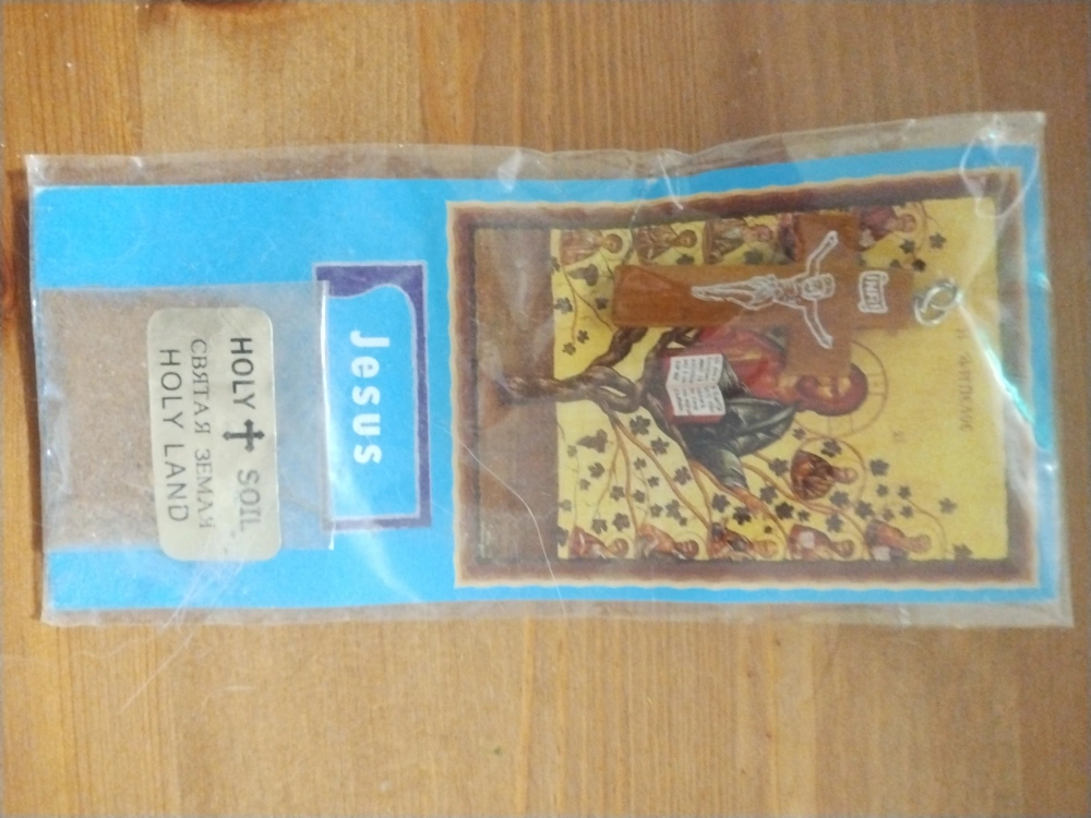 1000+Wooden crucifix keychain. Features image of Jesus on the cross. Includes small bag of Holy Land soil. Souvenir from the Holy Land.