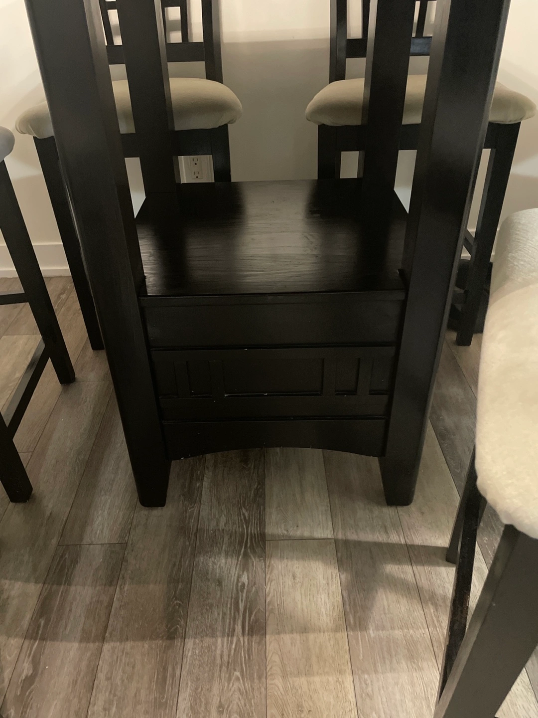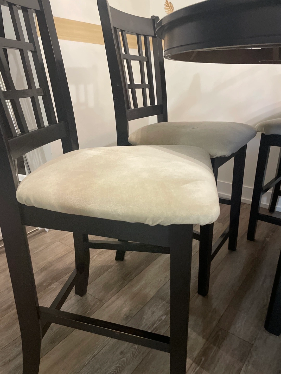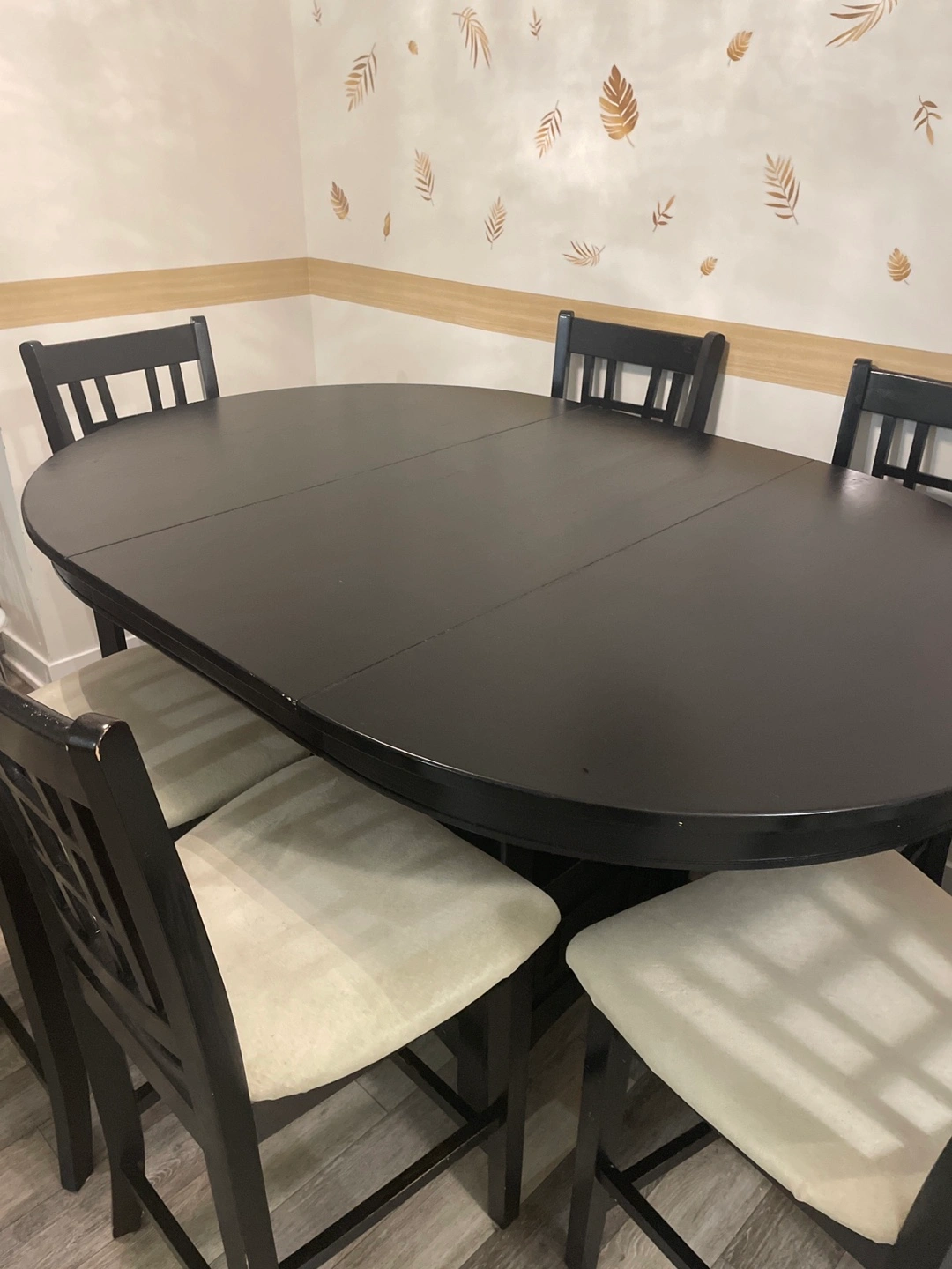 539Seven-piece dining set. Black brown oval table with extensions W150cm, when you remove it become circle table W106cm . Six coordinating chairs. Beige fabric cushions. It’s good condition