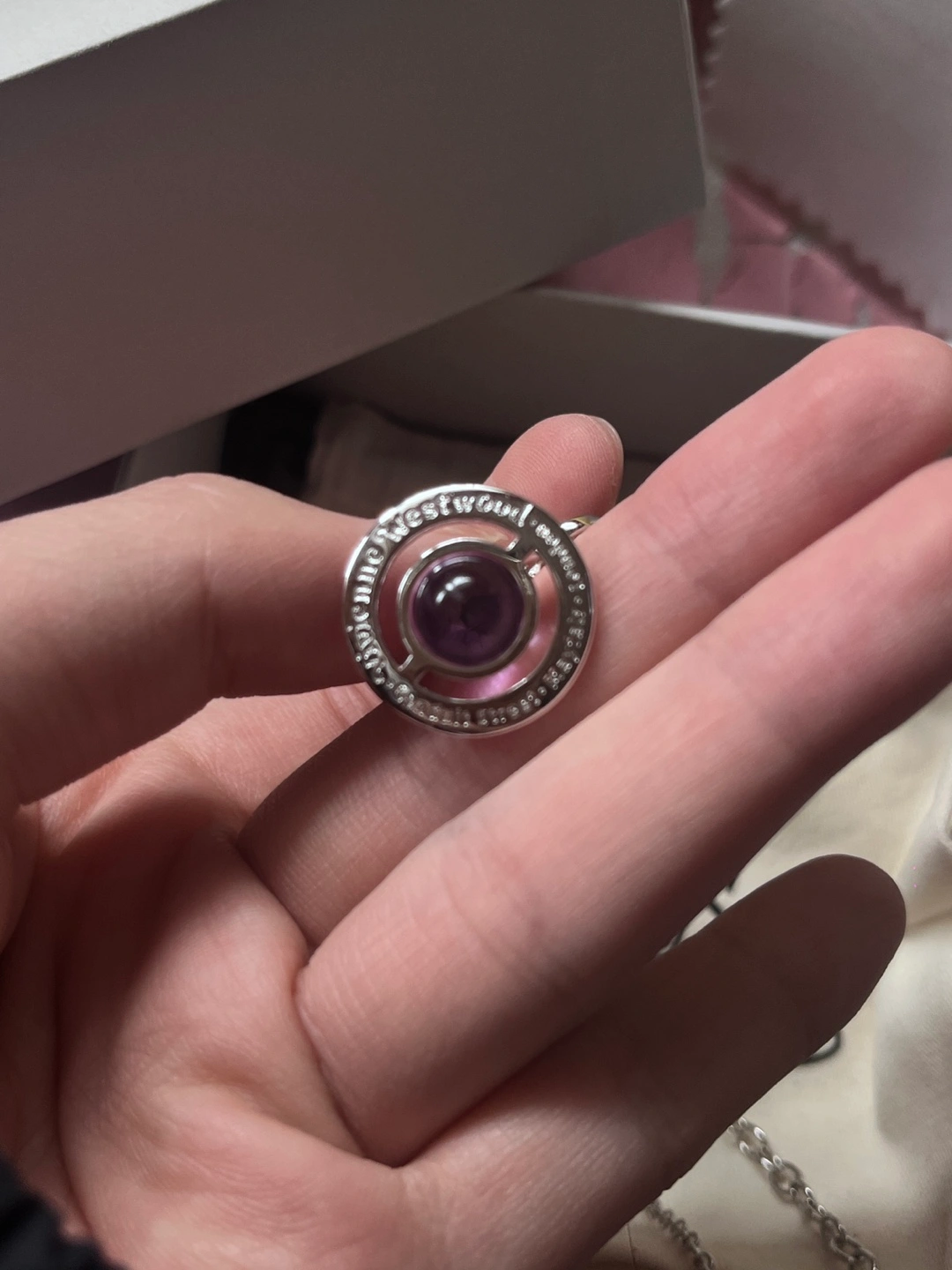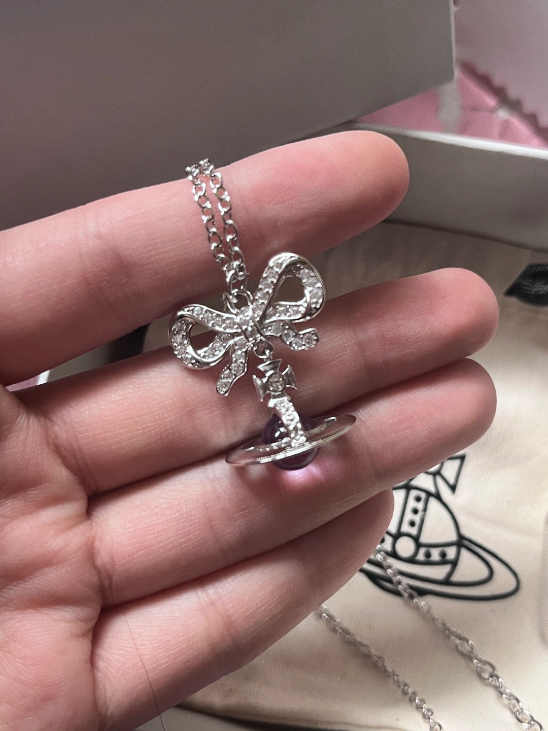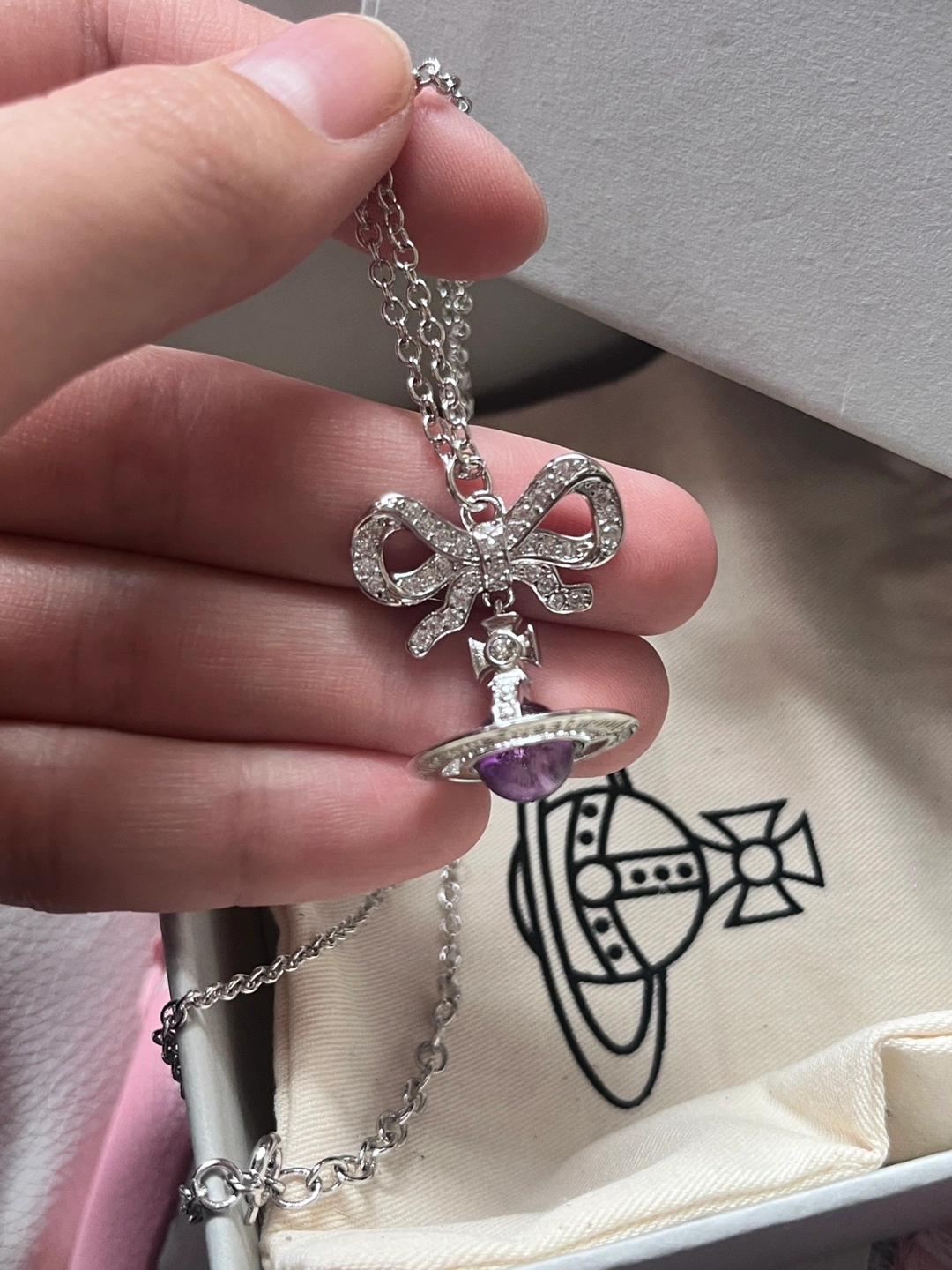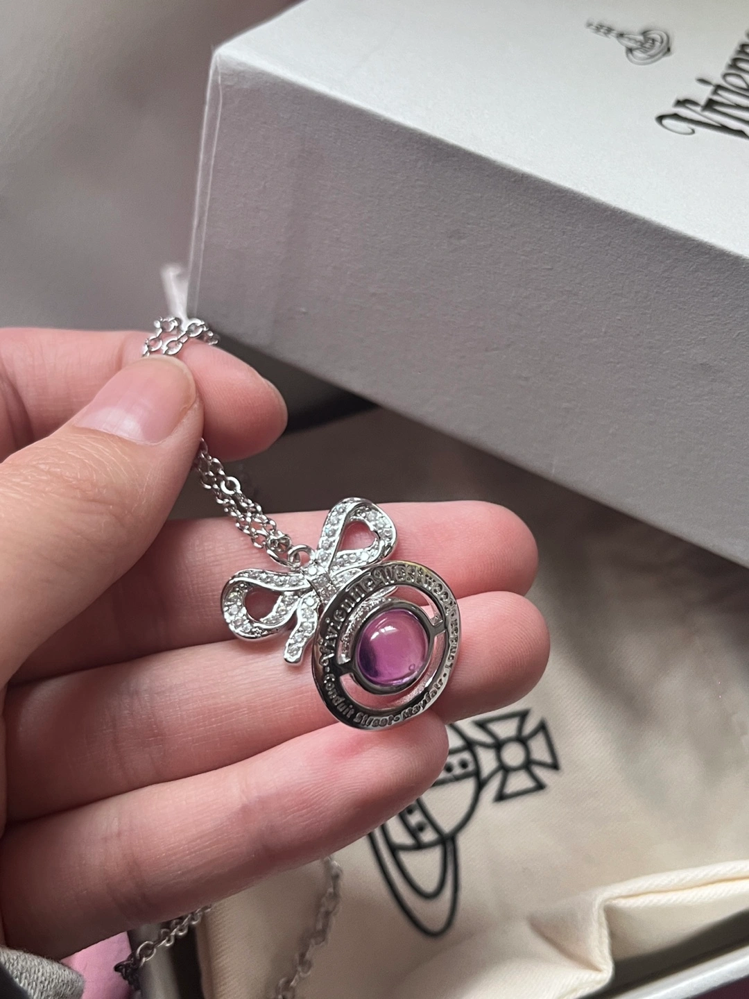 Silver-tone necklace. Features a purple orb pendant and a sparkly bow charm. Delicate chain. Comes in original box.