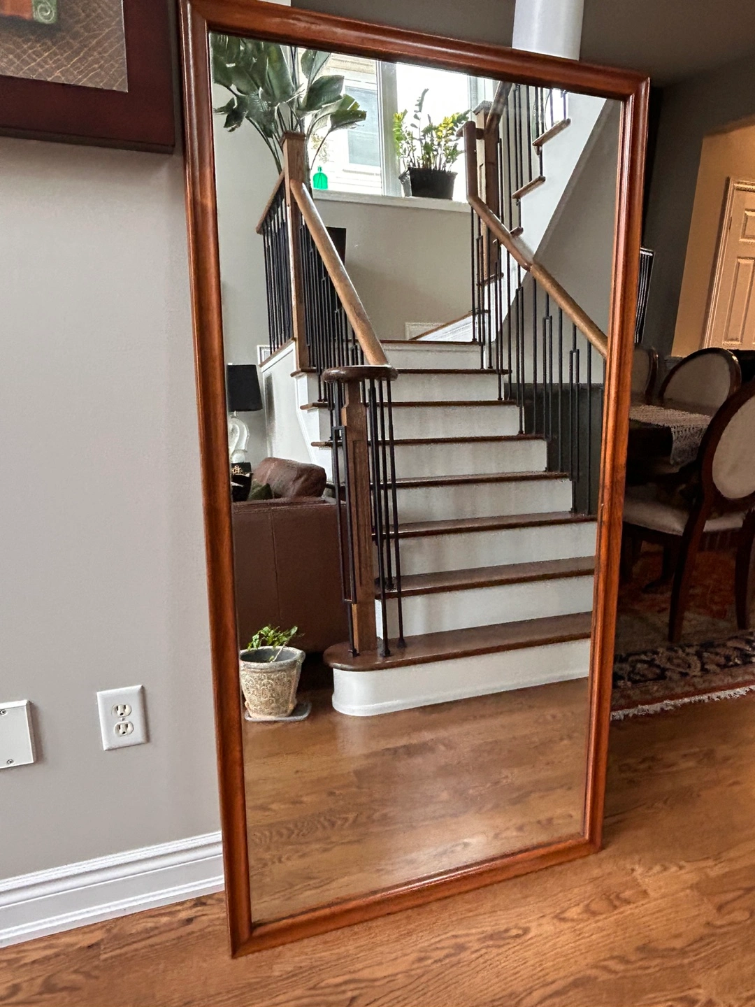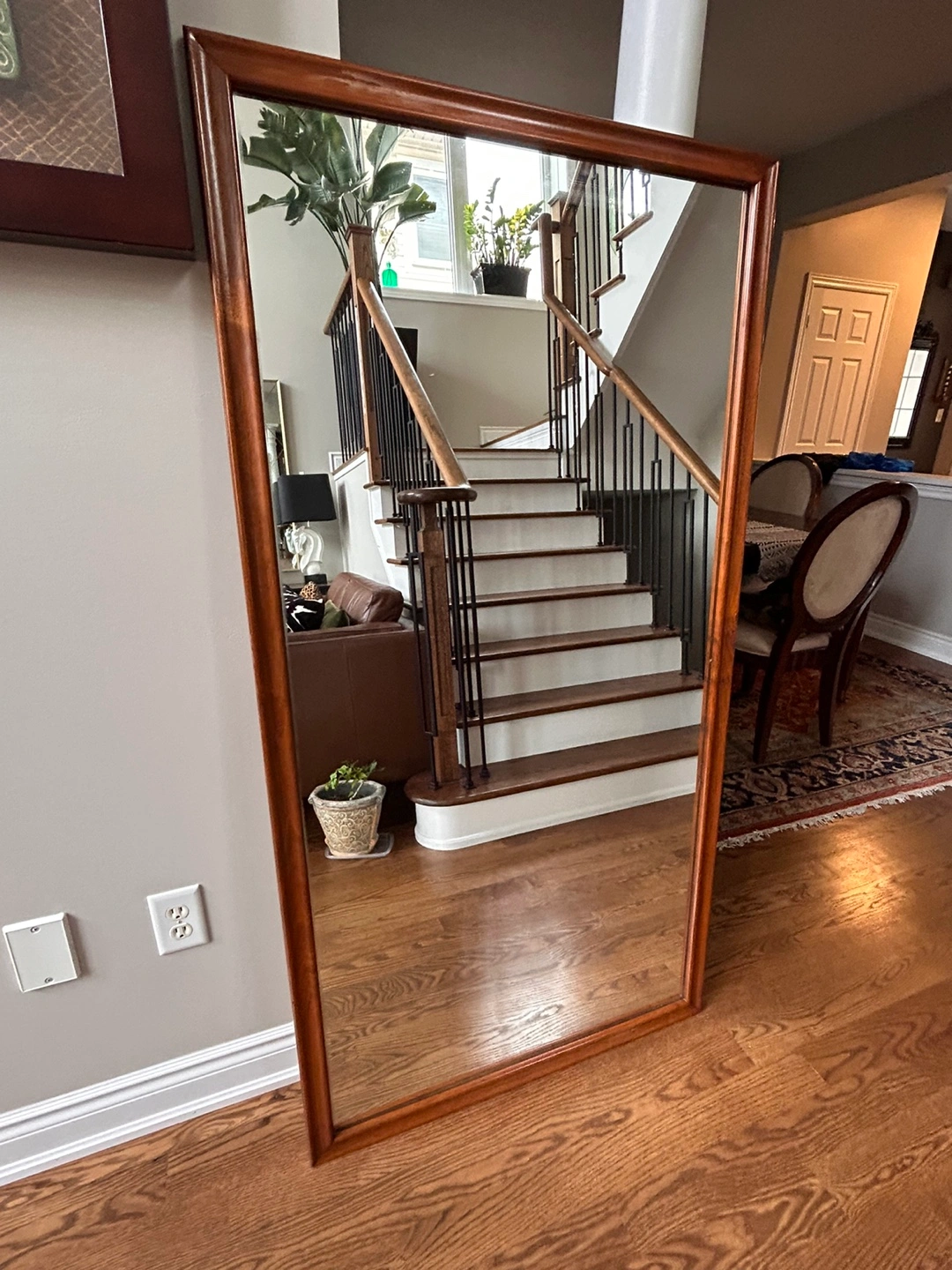 Large vintage floor mirror. Rectangular shape. Brown wood frame. Measurements are 62.5” by 32.5”.