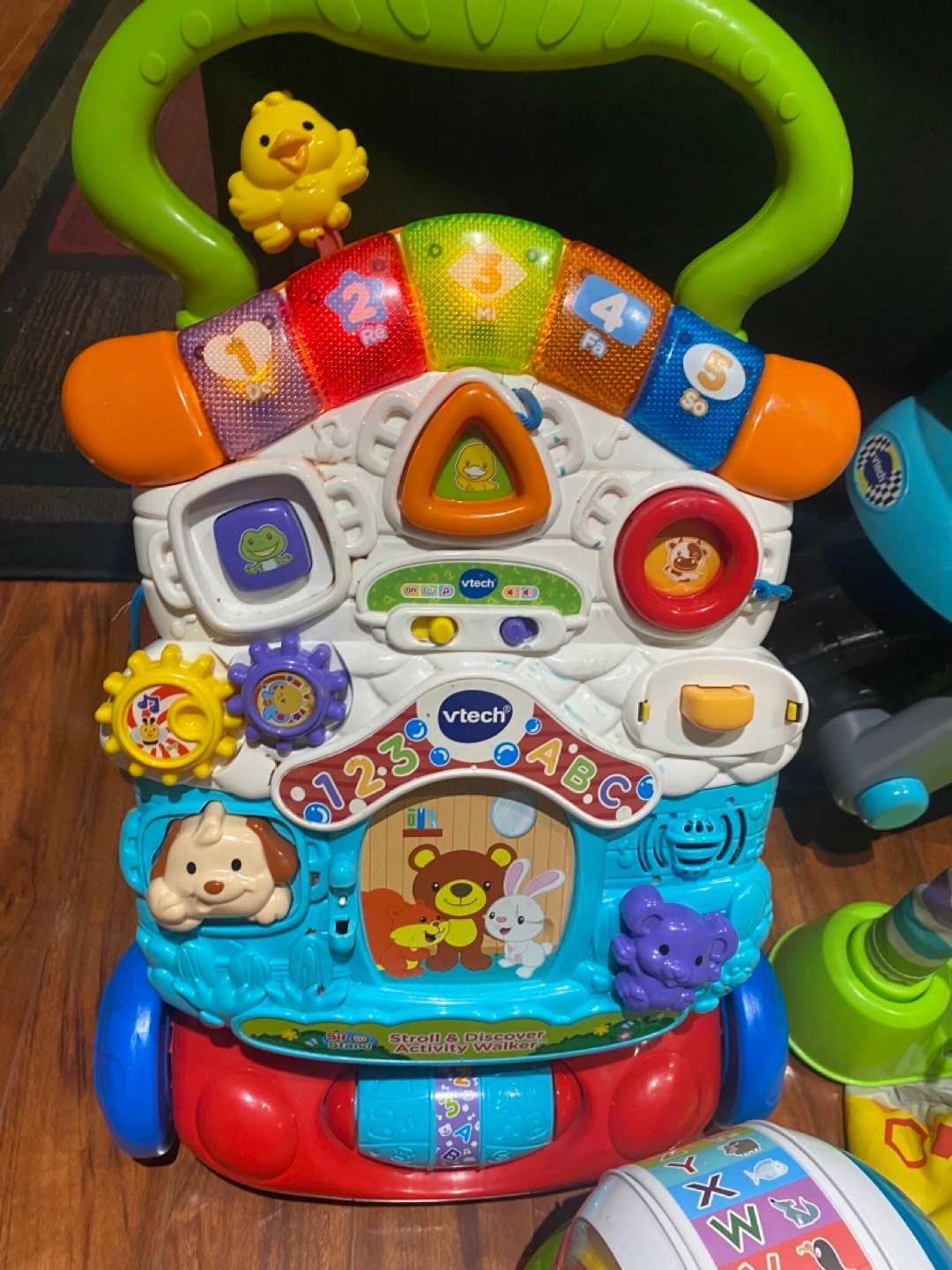 Pre-loved VTech baby walker. Features lights, sounds, and interactive activities. Great for encouraging learning and development. Shows some signs of use.