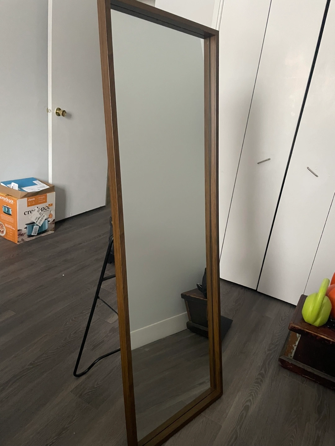 Floor-length mirror. Dark brown wood frame. Free-standing with metal stand. Perfect for any room.