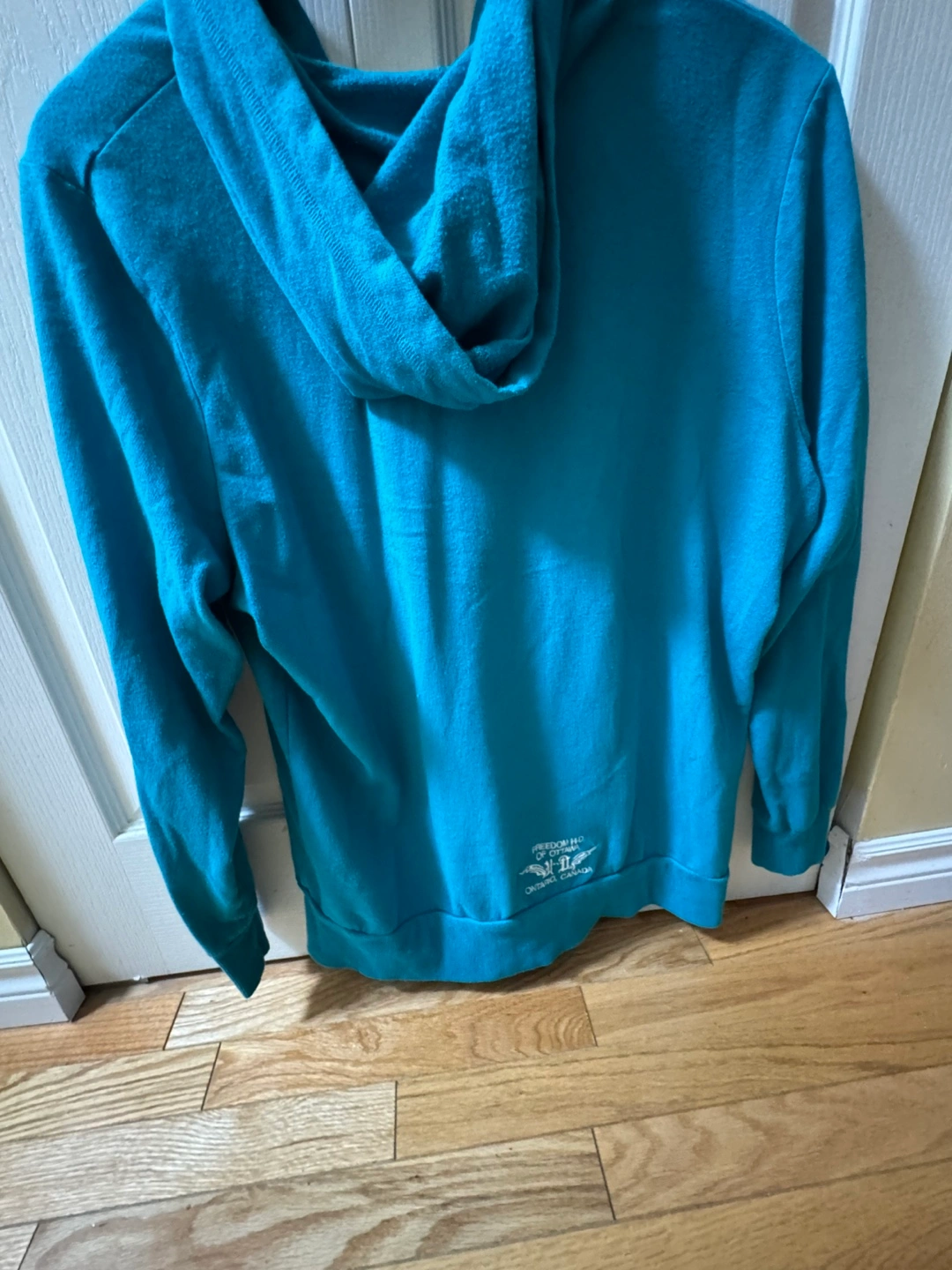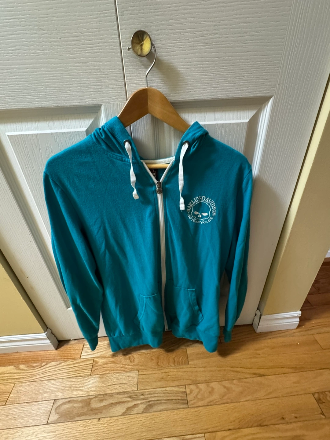 Women's teal zip-up hoodie. Features a small Harley Davidson logo on the chest. Long sleeves, classic hoodie style. Great for casual wear.