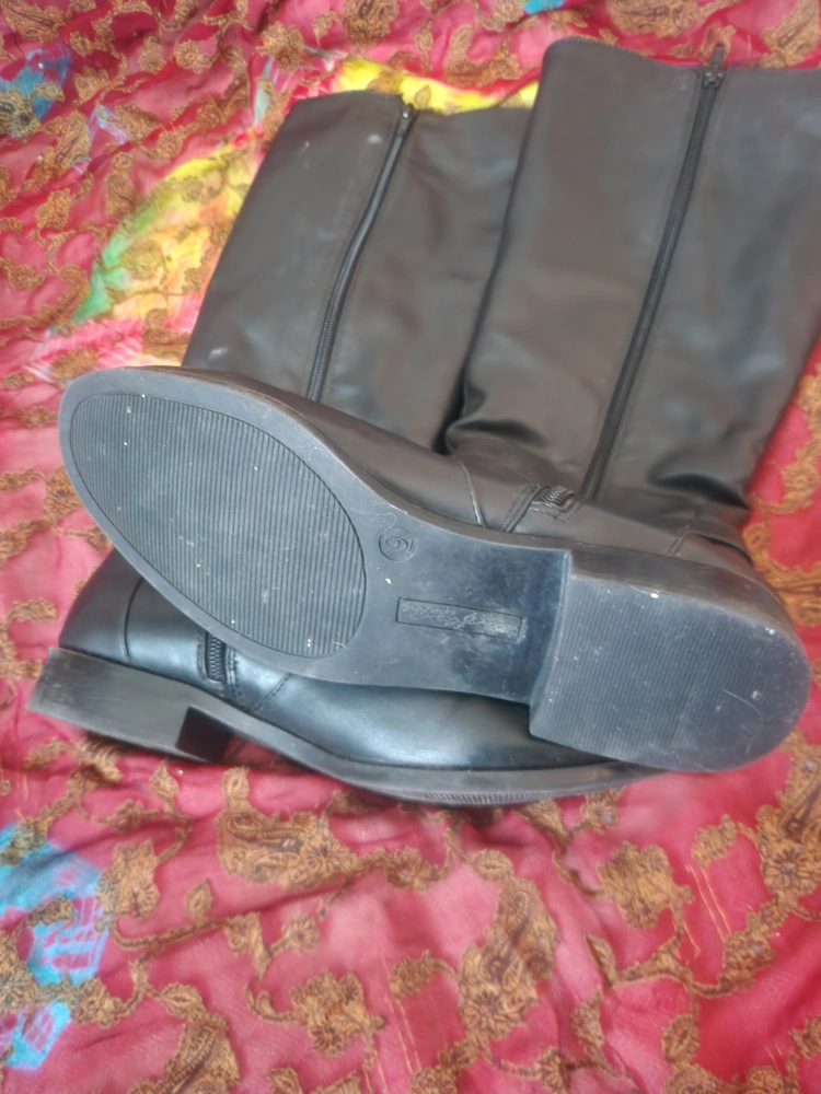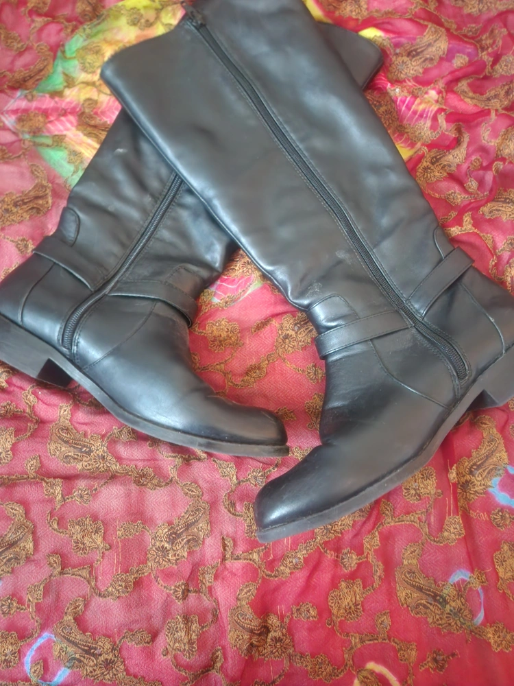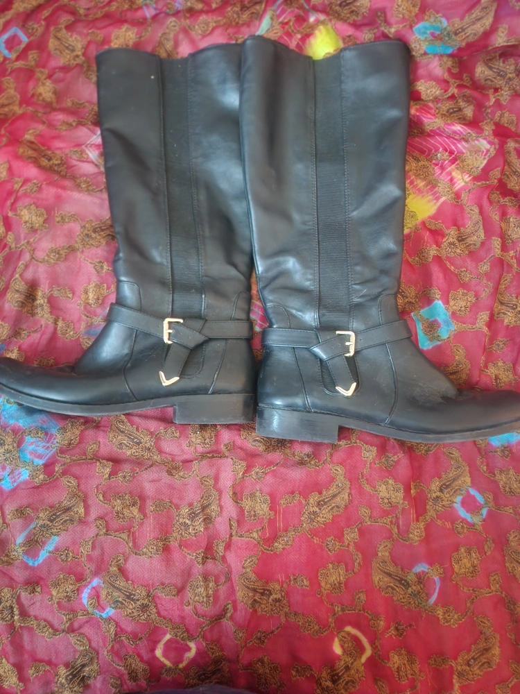pair of black pleather riding boots. Features silver buckle accents and side zippers. Aldo they are elasticated for comfort Good condition. Worn once, nice boot but i just can't wear any type of heel.