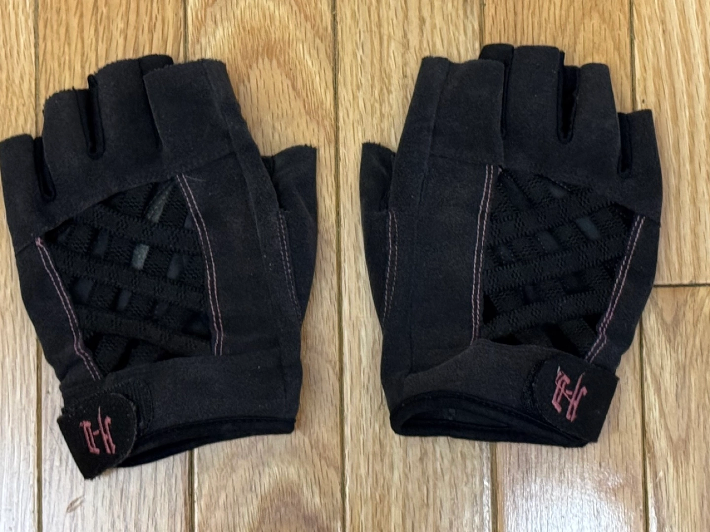 Pair of black Harley Davidson fingerless gloves. Mesh detailing. Wrist closure.