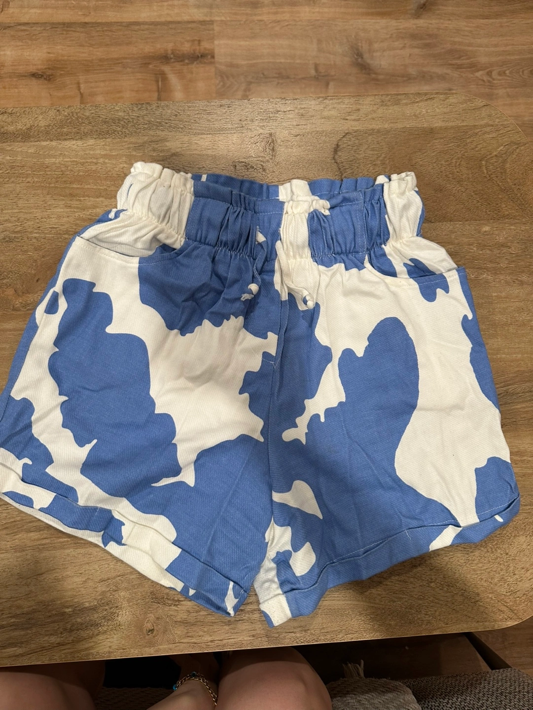 71Cute blue and white cow print design women's shorts. Elastic waistband with drawstring. Size Medium but runs small. Has Pockets.