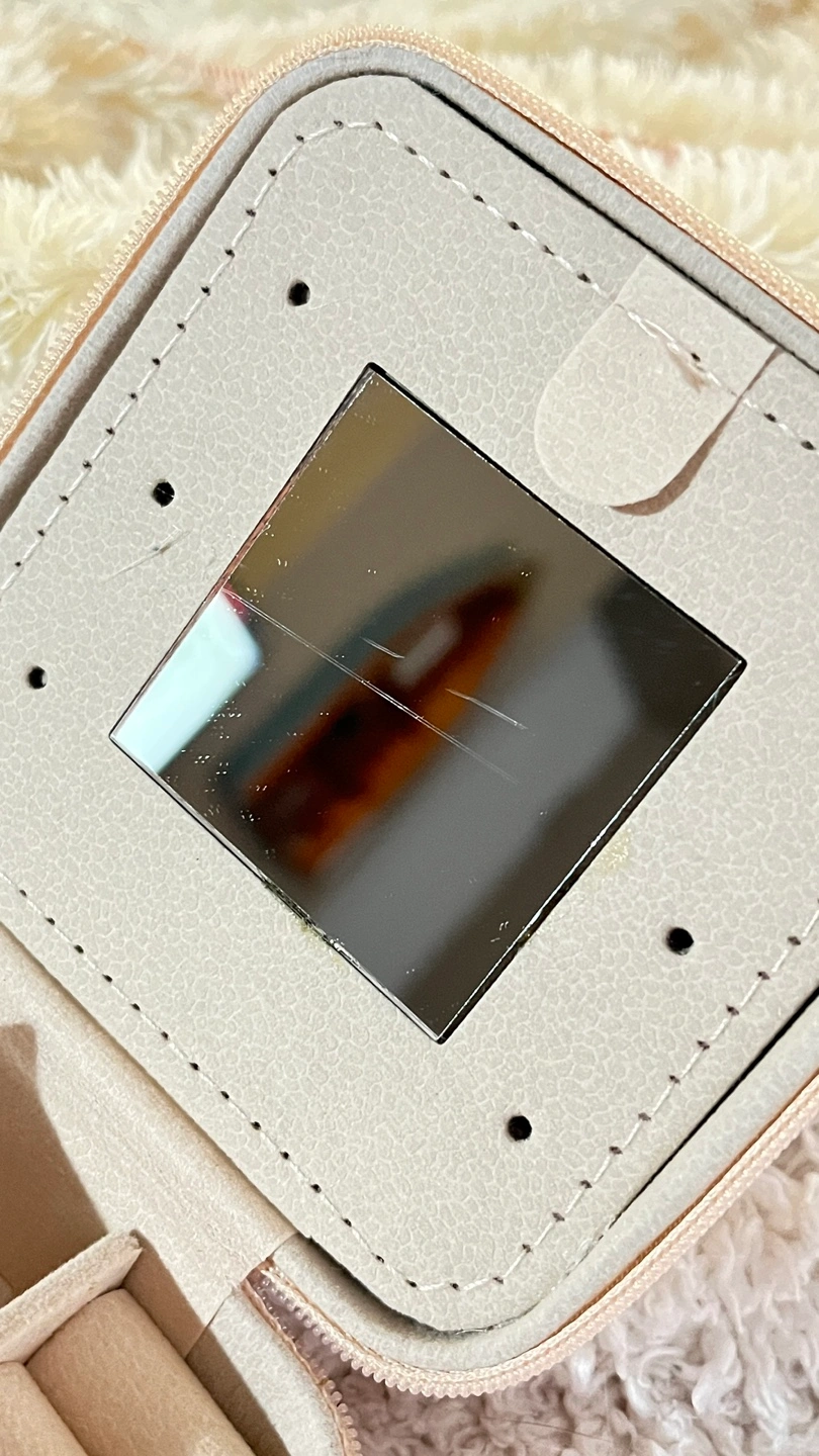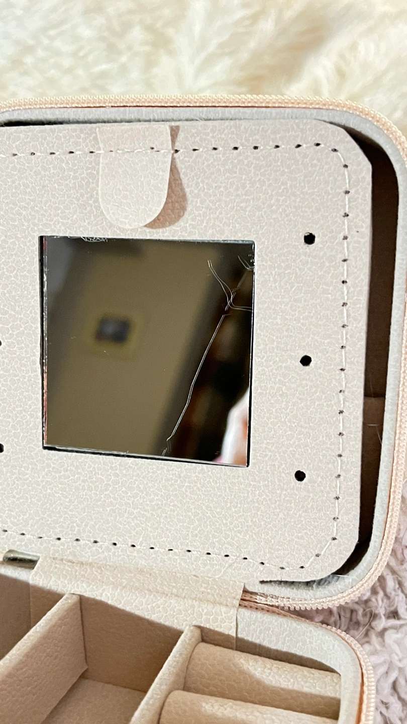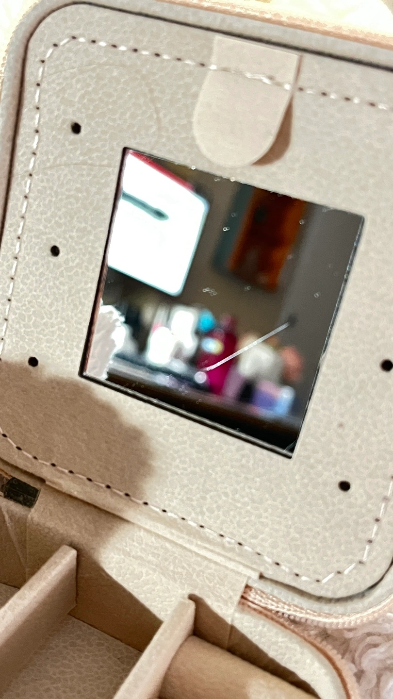 Compact travel jewelry organizer. Features multiple compartments for rings, earrings, and other small accessories. Includes a built-in mirror. Small crack in mirror.