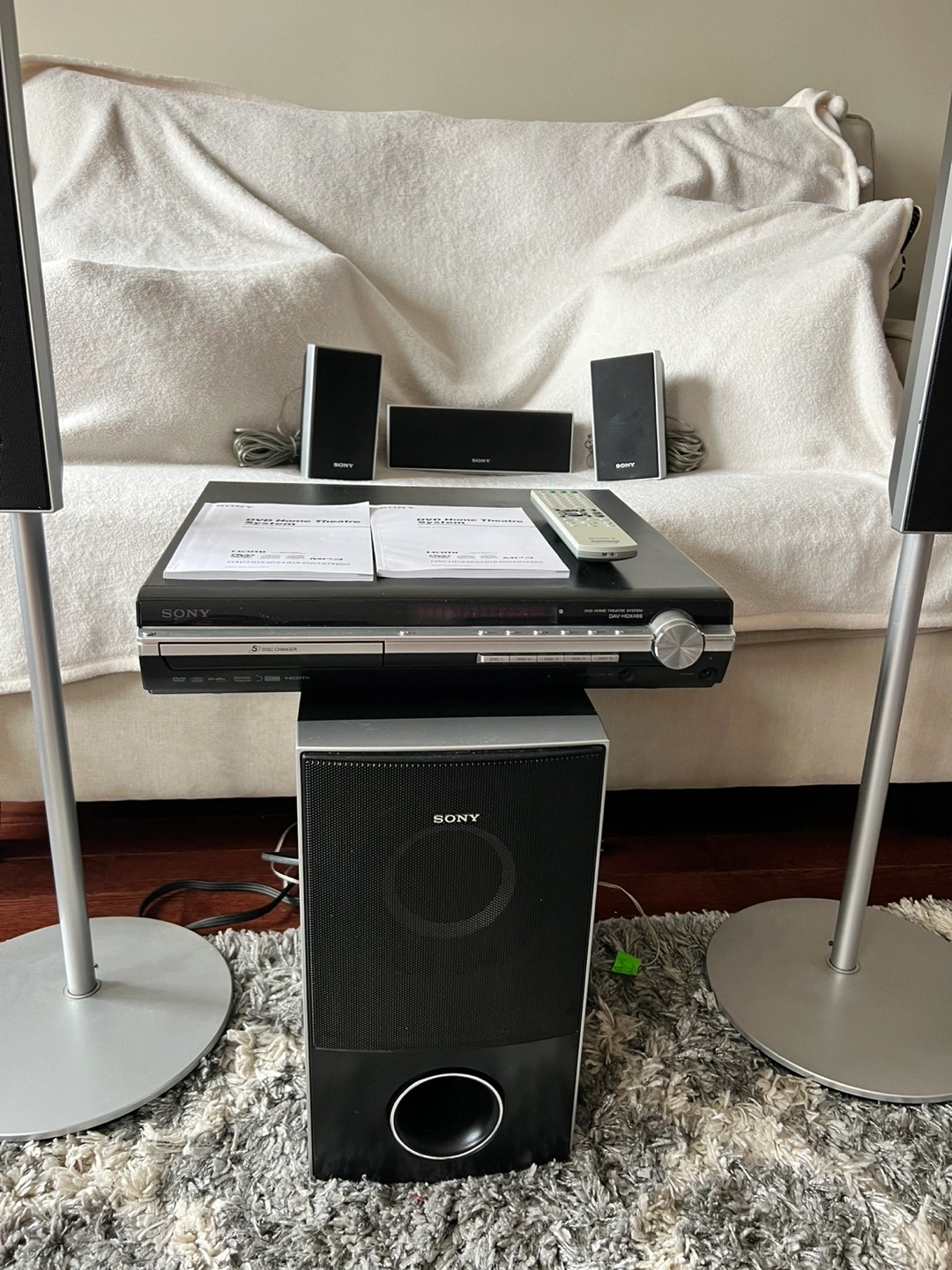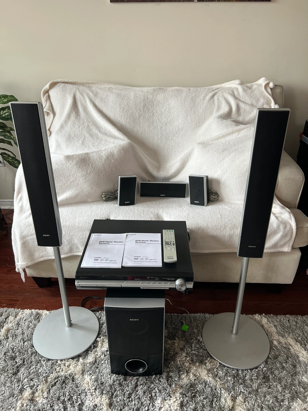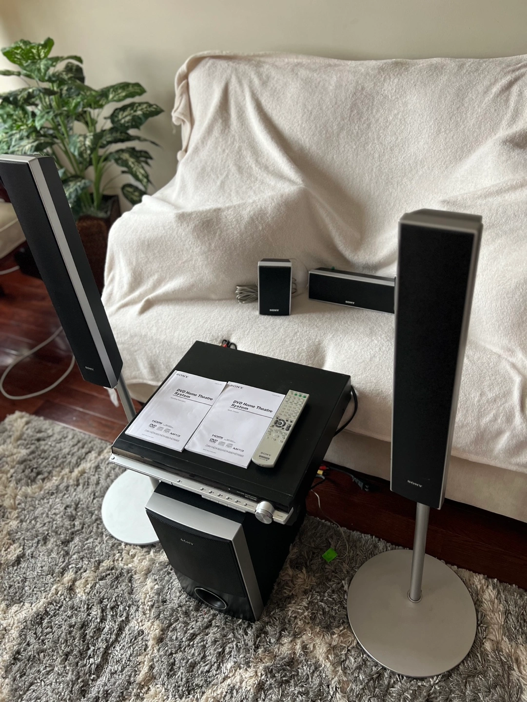 455.1 channel home theatre system. Includes DVD player, subwoofer, two floorstanding speakers, centre speaker and two satellite speakers. Remote and manuals included. Pre-owned.