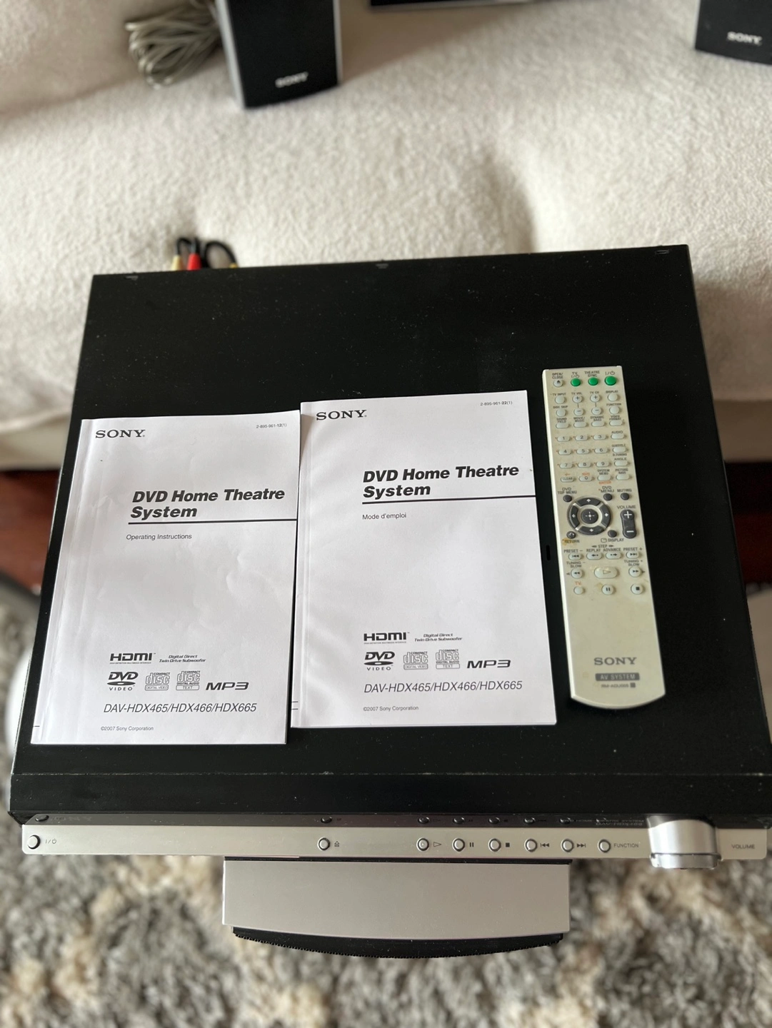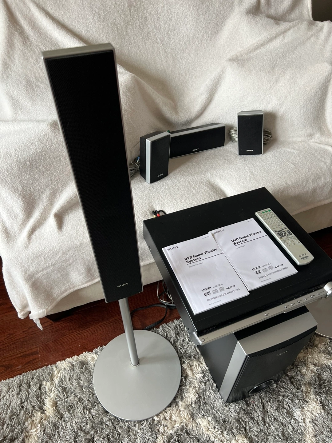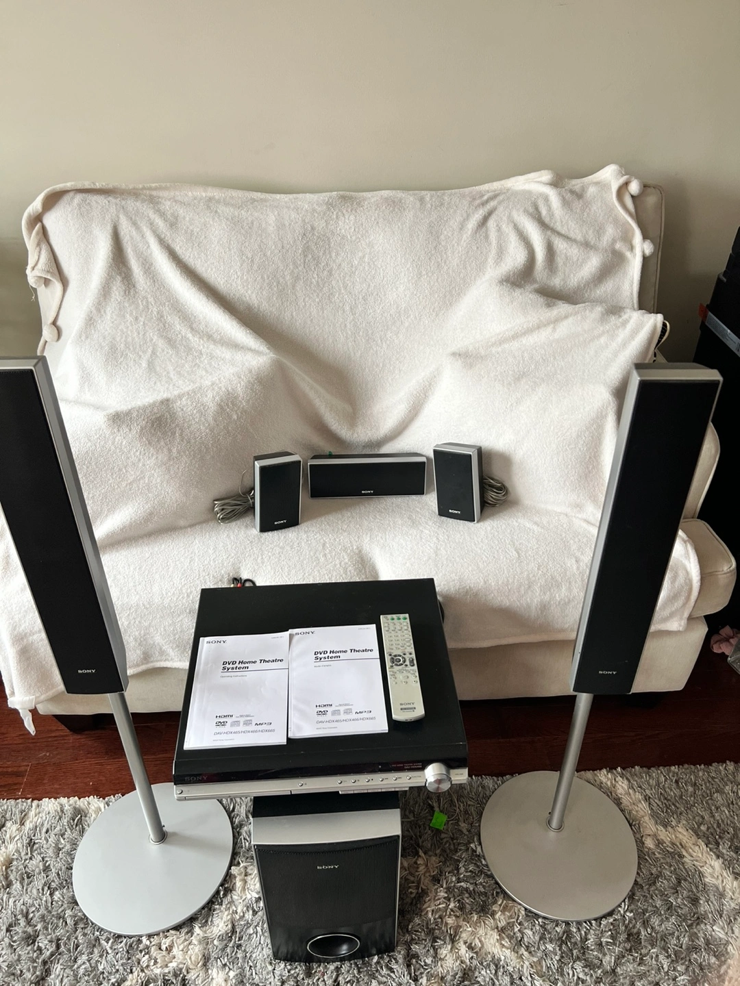 455.1 channel home theatre system. Includes DVD player, subwoofer, two floorstanding speakers, centre speaker and two satellite speakers. Remote and manuals included. Pre-owned.