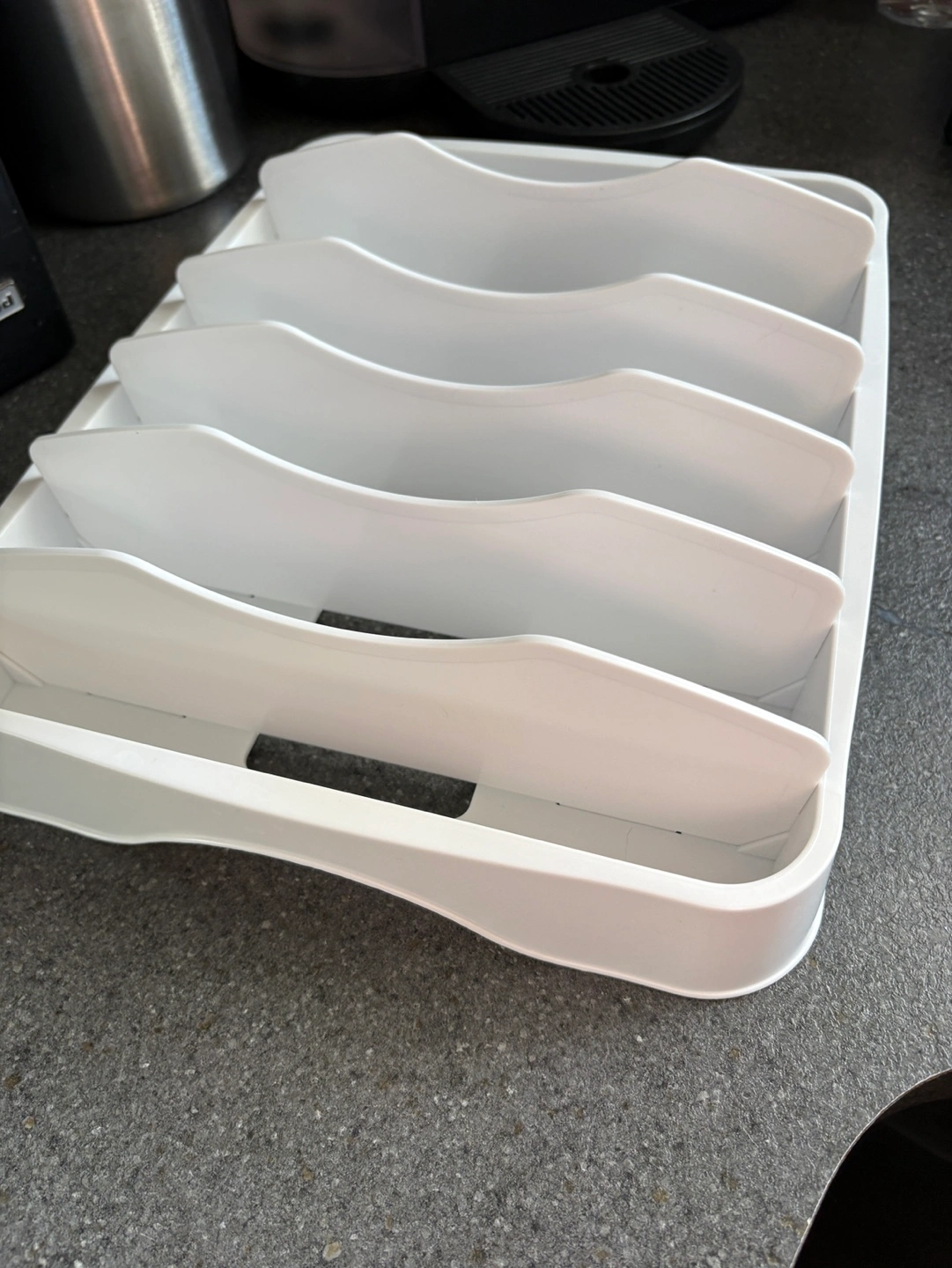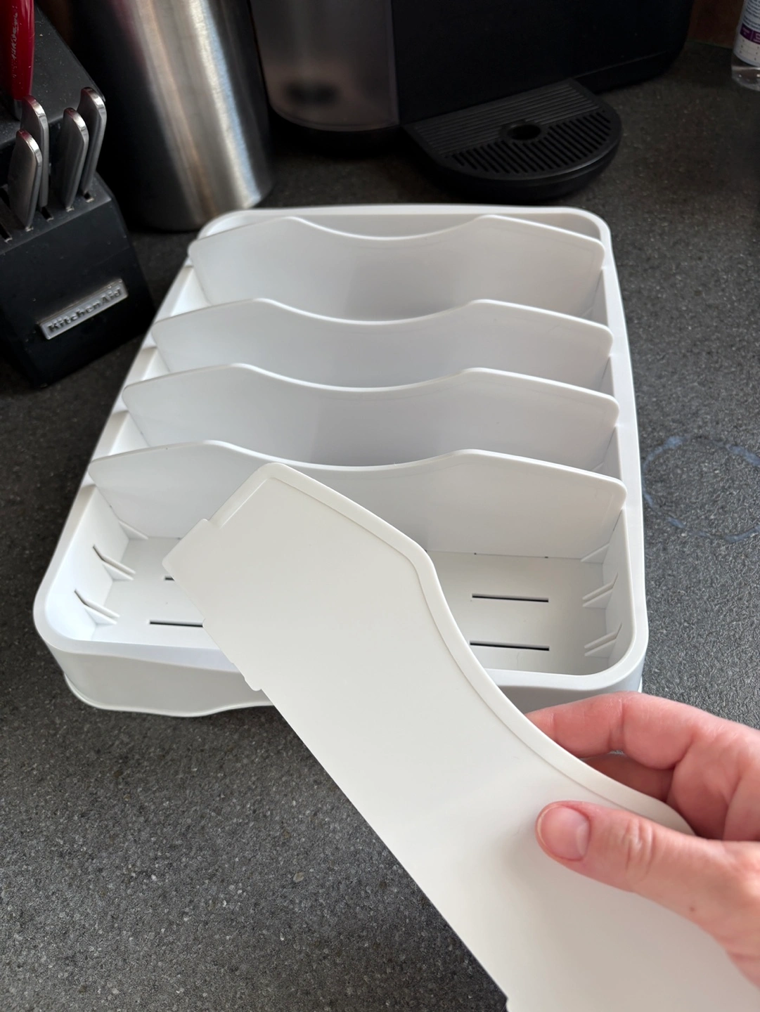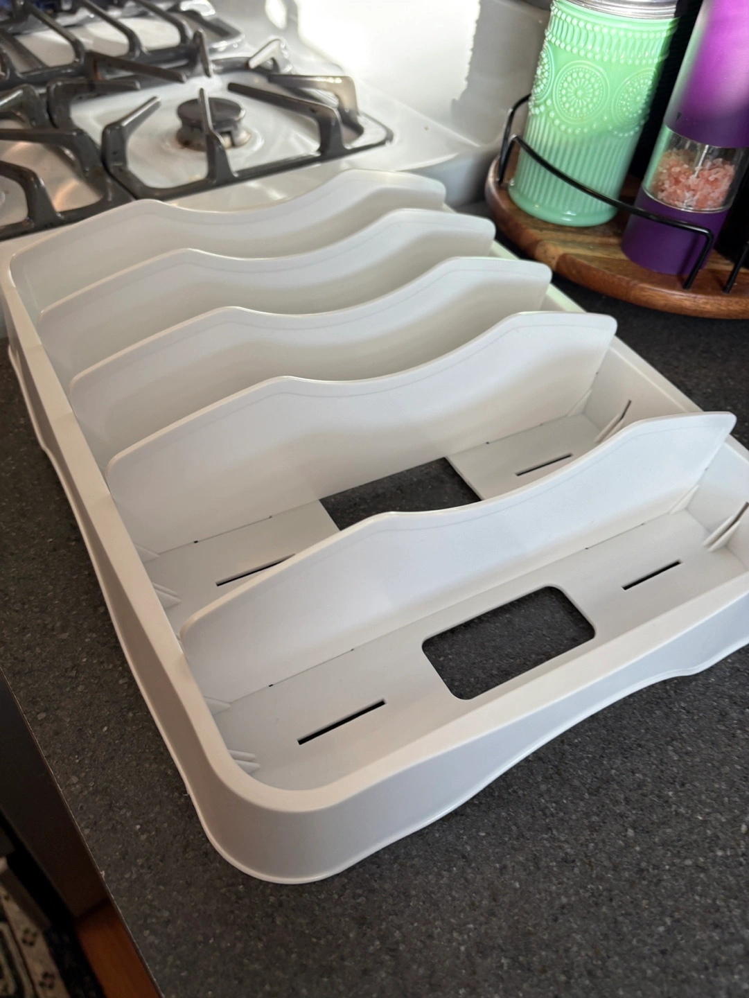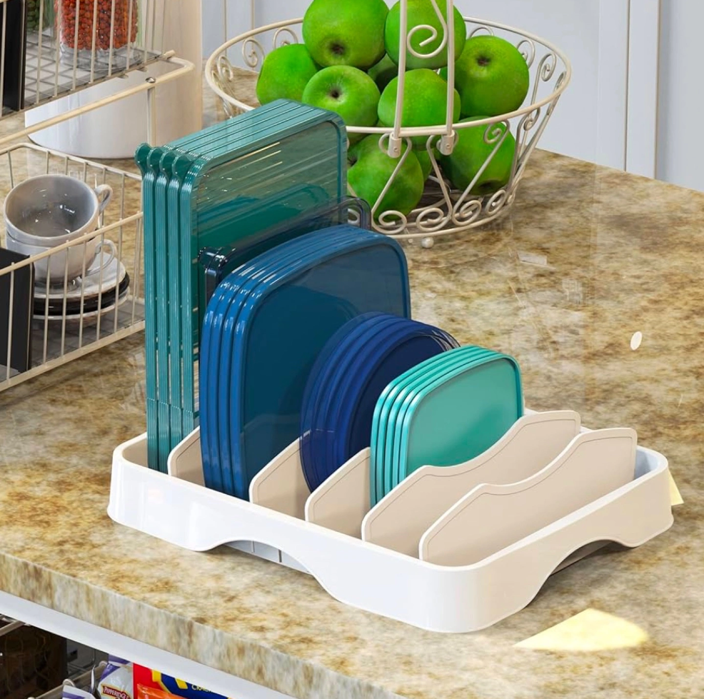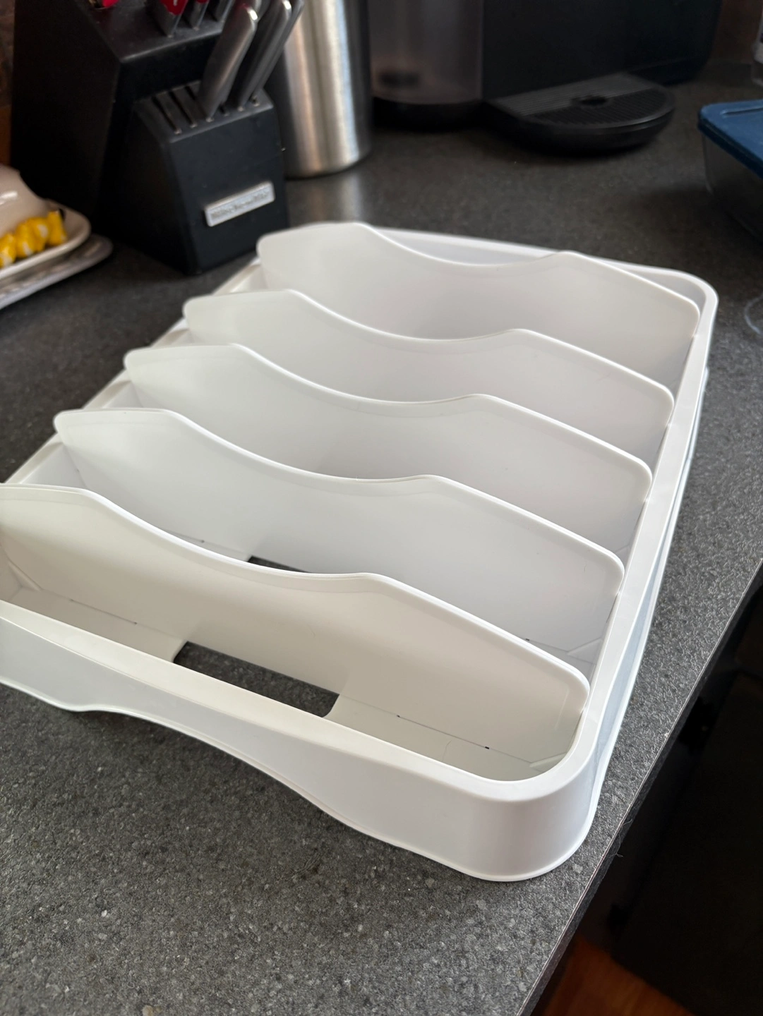 Five slots for storing various sized lids. Great for kitchen organization. Durable plastic construction.