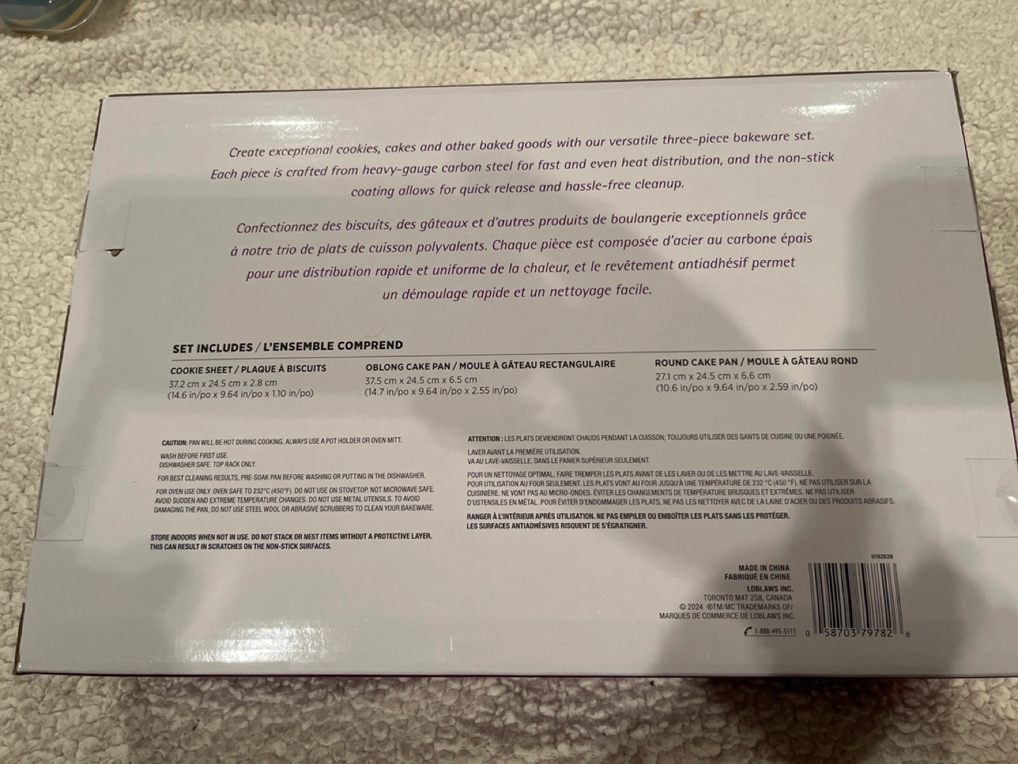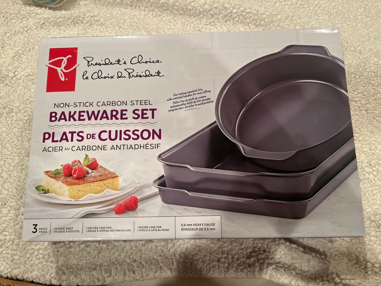 New in box. Three-piece bakeware set. Includes cookie sheet, oblong cake pan, and round cake pan. Non-stick carbon steel. Heavy-gauge. Easy cleanup.