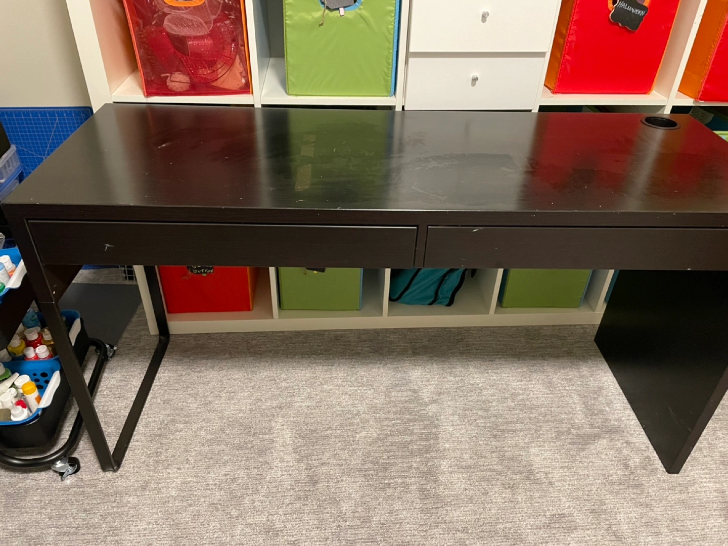 IKEA Black computer desk with two drawers. Some minor scratches and wear. Dent on top as indicated in photo. Very sturdy