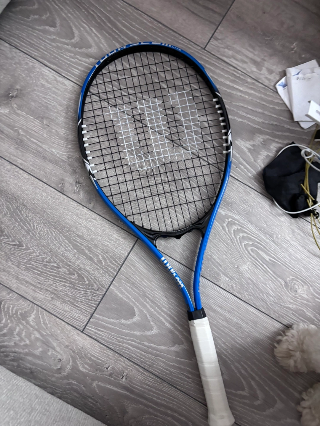 35Used tennis racquet. Blue and black. Good condition. Grip needs replacing. Grip size 3-4 3/8”